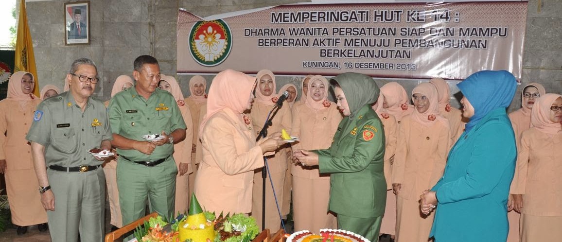 Dharma Wanita Persatuan ( DWP ) sebagai salah satu organisasi wanita merupakan kumpulan para istri Pegawai Negeri, yang dalam kegiatannya mereka harus serasi dan memotivasi para suami agar mampu memberikan kinerja yang baik bagi pelayanan kepada masyarakat. Dalam usia ke-14 ini, DWP diharapkan dapat memberikan kemandirian baik bagi organisasi maupun untuk terus berkiprah dan berjalan dengan penuh motivasi yang tinggi sehingga tujuan dari organisasi tersebut dapat berjalan dengan baik. Acara puncak peringatan HUT Dharma Wanita ke-14 Tingkat Kabupaten Kuningan digelar di Pendopo Kabupaten Kuningan, Senin (16/13). Hadir dalam kesempatan tersebut Bupati Kuningan, Hj. Utje Choeriah Hamid Suganda, Wakil Bupati, H. Acep Purnama, Sekda, H. Yosep Setiawan, Ketua TP. PKK sekaligus Penasehat DWP, Hj. Ika Acep Purnama, Ketua Persit Candra Kirana, Ketua Bayangkari, dan undangan lainnya.