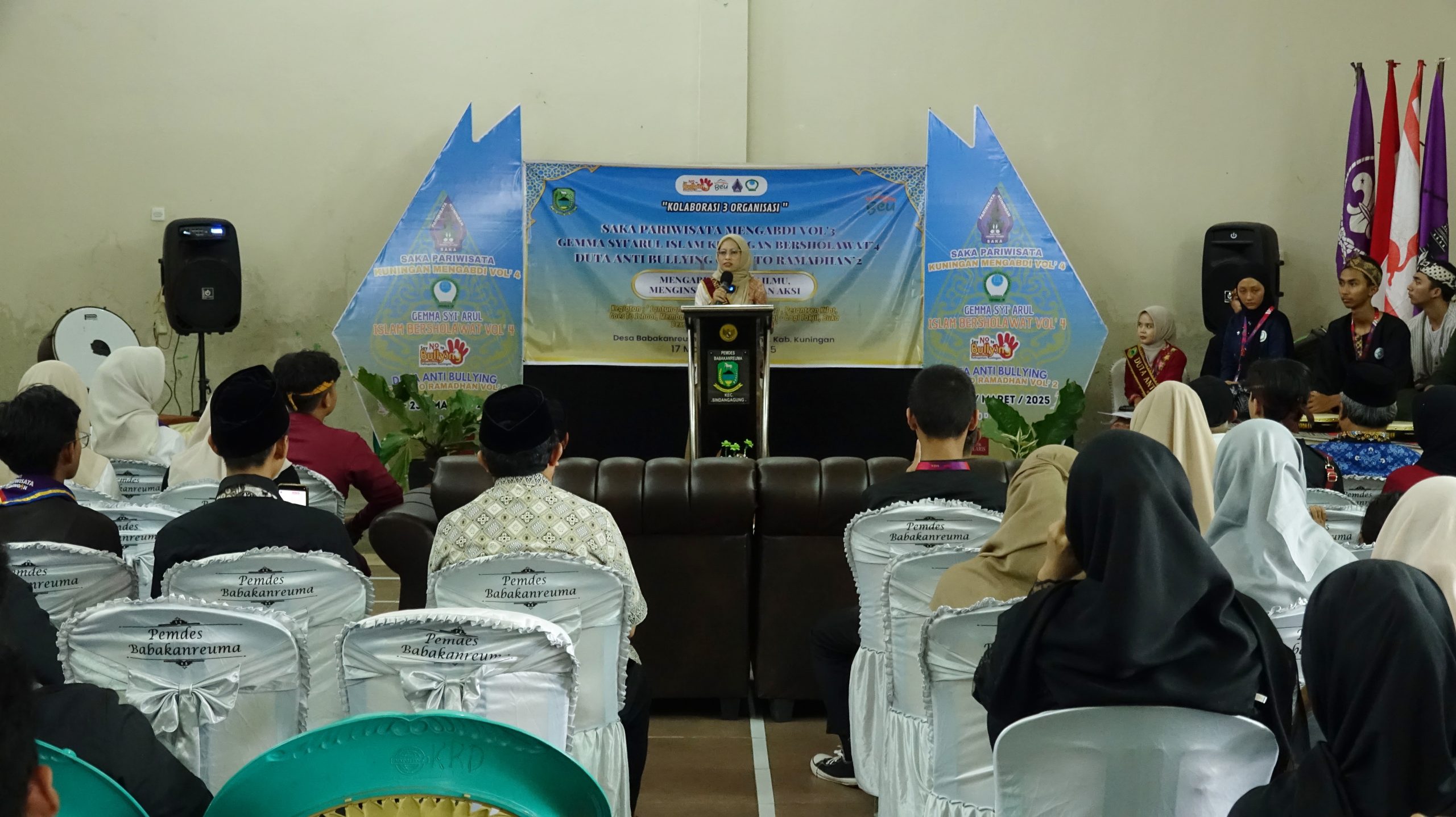 KUNINGAN – Ketua TP PKK Kab. Kuningan yang juga merupakan Bunda Anti Bullying, Hj. Ela Helayati, S.Sos, secara resmi membuka acara Kolaborasi Tiga Organisasi Mengabdi. Kegiatan yang digelar di Aula Kantor Desa Babakanreuma, Kecamatan Sindangagung, Senin (17/03/2025) ini, dihadiri Ketua BAZNAS Kabupaten Kuningan, perwakilan Disporapar Kabupaten Kuningan, Kepala Desa Babakanreuma, Ketua PKK Desa Babakanreuma, serta jajaran pengurus dan anggota dari tiga organisasi pemuda, yaitu Duta Anti Bullying, Gema Syiarul Islam, dan Saka Pariwisata.