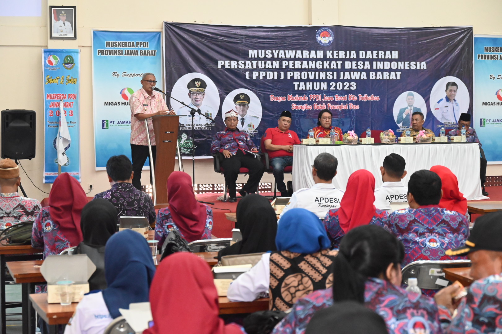 KUNINGAN-Bupati Kuningan H. Acep Purnama, SH., MH mengisi arahan pada Musyawarah Kerja Daerah (MUSKERDA) Persatuan Perangkat Desa Indonesia (PPDI) Provinsi Jawa Barat Tahun 2023. Yang bertempat di Aula Sajati BKPSDM. Jum’at (12/5/2023). Yang juga dihadiri Anggota DPR RI Ono Surono, ST, Kepala DPMD Drs. Dudi Pahrudin, M.Si.