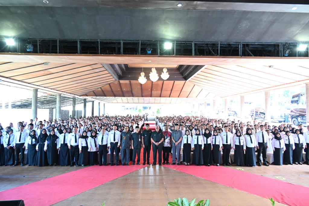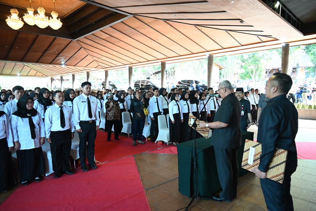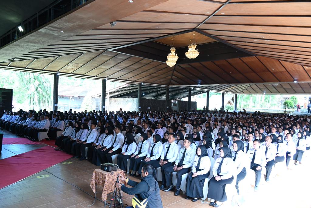 KUNINGAN – “Dengan memanjatkan Puji syukur kehadirat Allah S.W.T, atas taufiq dan hidayah-nya, maka pada Hari ini, kamis tanggal 13 Juli 2023, Saya Bupati Kuningan, dengan ini secara resmi melantik: Saudara – saudara sebagai Pegawai Pemerintah Dengan Perjanjian Kerja di Lingkungan Pemerintah Daerah Kabupaten Kuningan, saya percaya bahwa saudara – saudara akan melaksanakan tugas dengan sebaik-baiknya, sesuai dengan tanggung jawab yang diberikan. Semoga Allah S.W.T bersama kita…” Demikian kata-kata Pelantikan yang diucapkan oleh Bupati Kuningan, H. Acep Purnama SH MH yang diikuti oleh 764 Pegawai Pemerintah Dengan Perjanjian Kerja (PPPK) Jabatan Fungsional guru yang akan bertugas mengabdi di berbagai Sekolah SD dan SMP se-Kabupaten Kuningan. Kamis (13/07/2023) bertempat di Aula Prima Resort Hotel, Sangkanurip Kecamatan Cigandamekar.