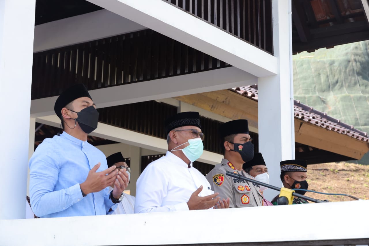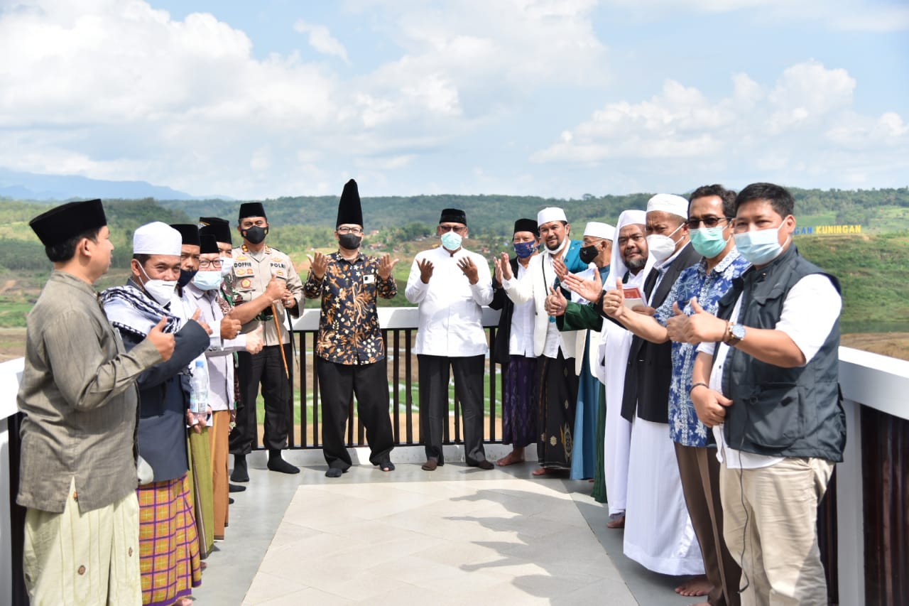 KUNINGAN,- Bupati Kuningan H. Acep Purnama, SH.,MH di dampingi Wakil Bupati Kuningan M. Ridho Suganda, SH., M.Si, Sekda Kuningan Dr. H. Dian Rachmat Yanuar, M.Si. Doa bersama diikuti para tokoh agama, unsur Forkopimda Kab.Kuningan, Para Kepala SKPD. Kegiatan yang berlangsung Khusyu ini di pusatkan di lokasi Bendungan Kuningan, Jumat (18/06/2021)