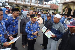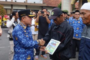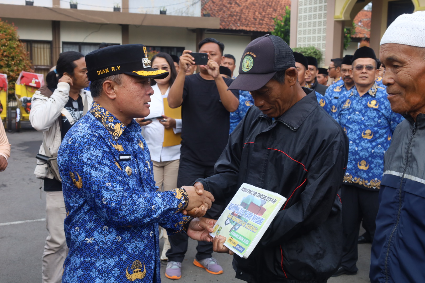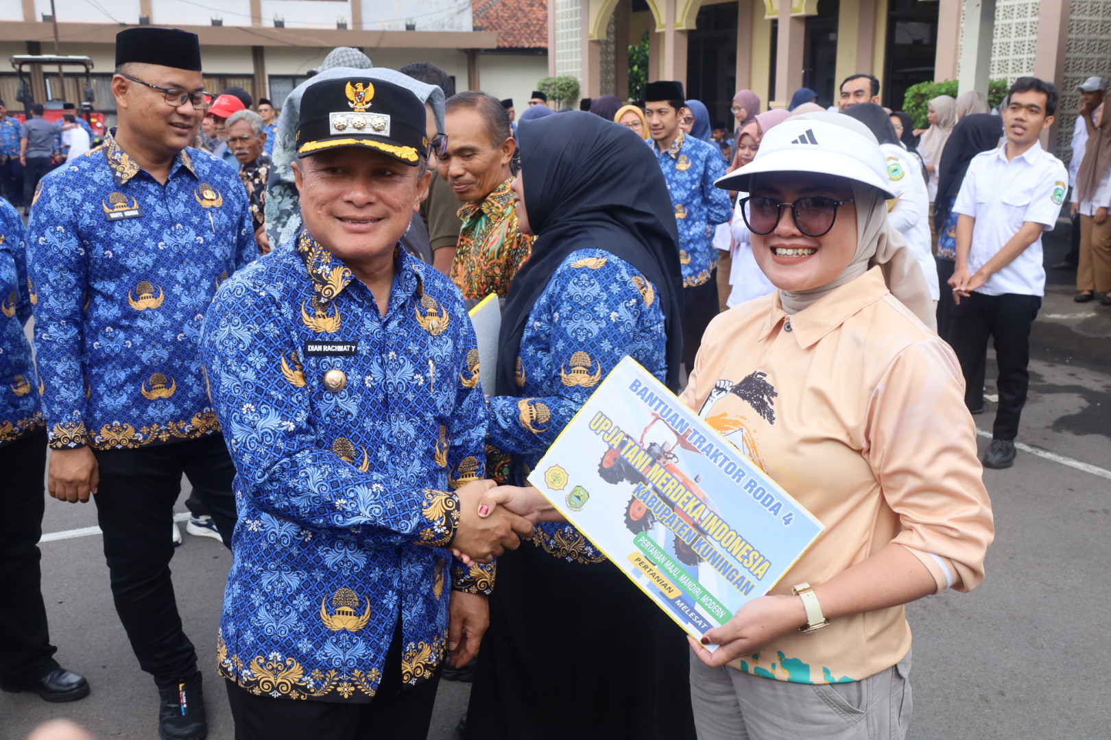 Penyerahan bantuan secara simbolis langsung oleh Bupati Kuningan, Dr. H. Dian Rachmat Yanuar, M.Si, ketika Apel Pagi yang digelar di halaman Kantor Dinas Pertanian dan Ketahanan Pangan (Diskatan) Kabupaten Kuningan, Selasa (17/6/2025).