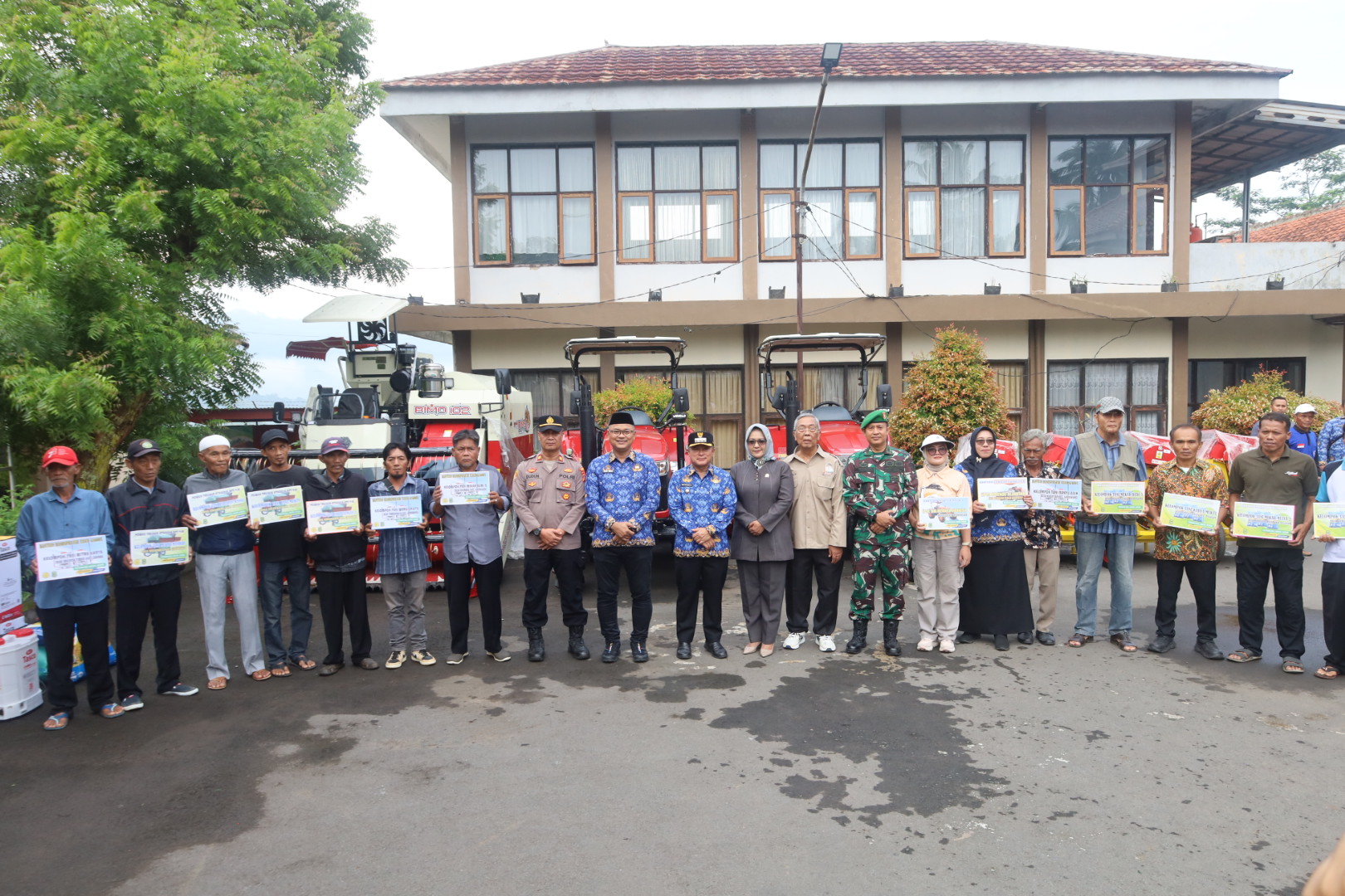 Kepala Diskatan Kabupaten Kuningan, Dr. Wahyu Hidayah, M.Si, menyampaikan bahwa bantuan yang disalurkan terdiri dari 1 unit combine harvester, 2 unit traktor roda empat, 20 unit power thresher, dan 18 unit hand sprayer.