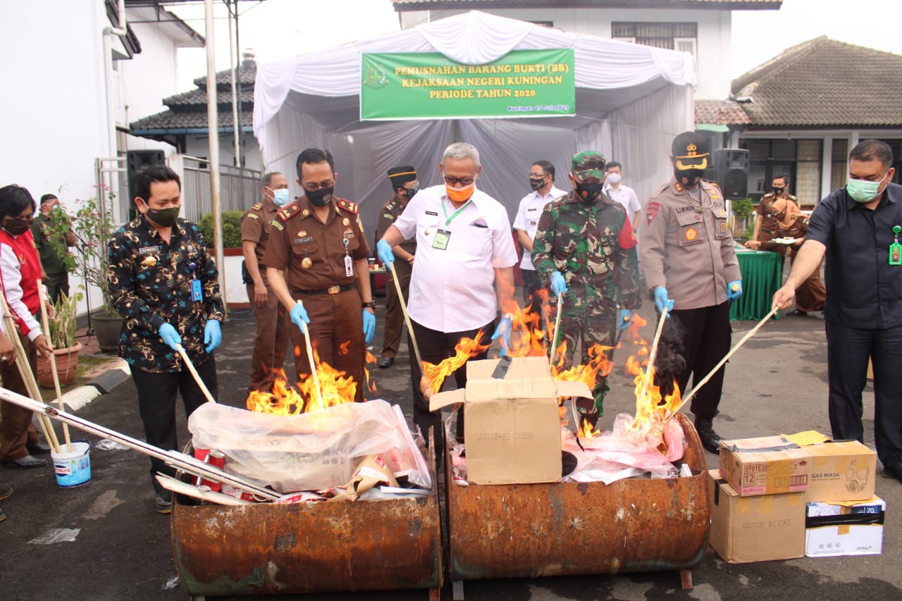 KUNINGAN, Kejaksaan Negeri Kuningan melaksanakan Kegiatan Pemusnahan Barang Bukti Periode Tahun 2020 di halaman Kantor Kejaksaan Negeri Kuningan, Rabu (15/07/2020) Dalam acara tersebut hadir Bupati Kuningan H.Acep Purnama, Sh, MH. , Kapoleres Kuningan Lukman Syafri Dandel Malik, S.I.K, Dandim 0615 Kuningan Karter Joyi Lumi, S.I.P, Ketua Pengadilan Negeri Kuningan Damenta Alexander, SH, M.HUM, Kepala BNNK Kuningan dan Forum Koordinasi Pimpinan (FKPD) Kabupaten Kuningan.