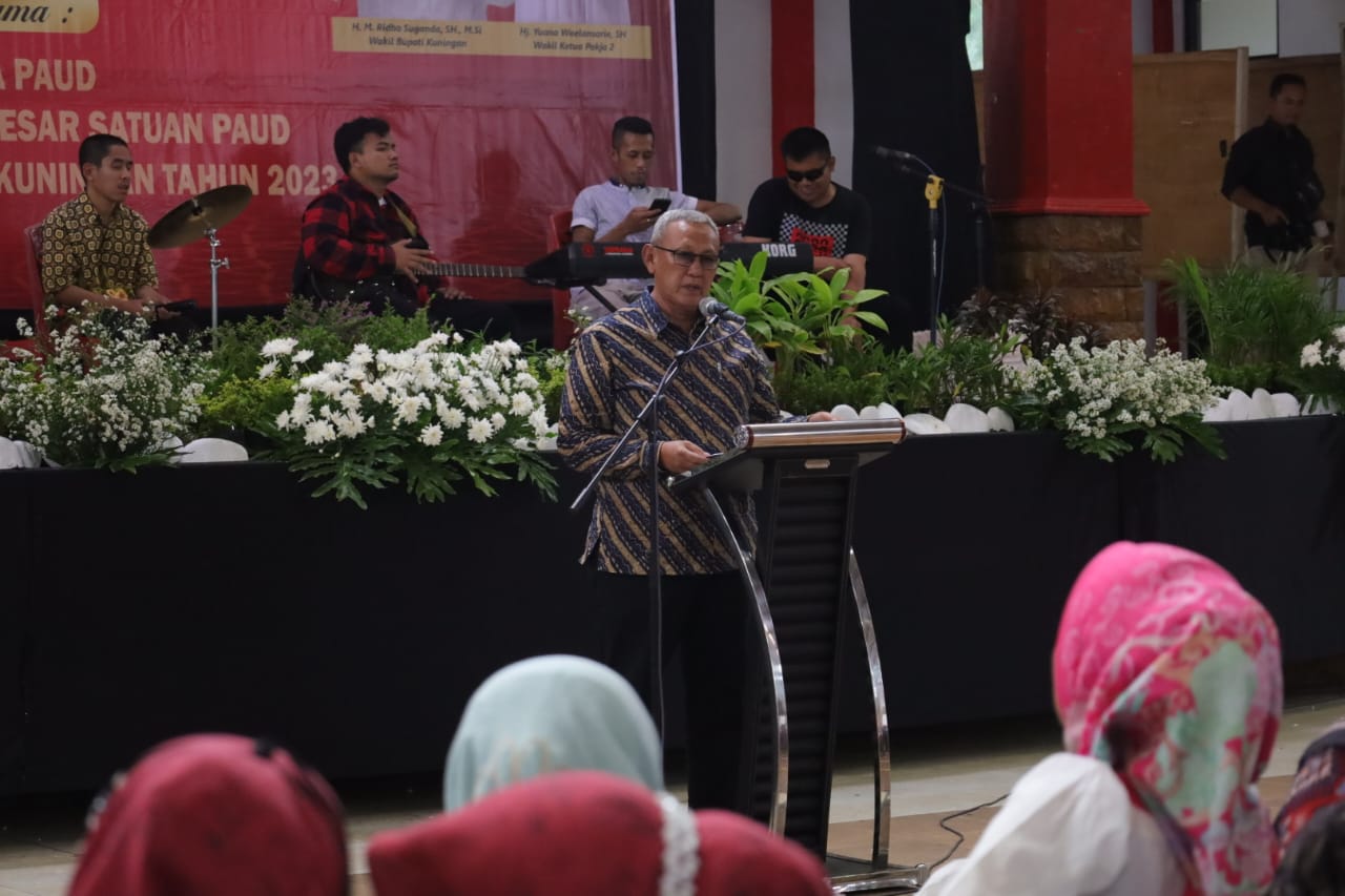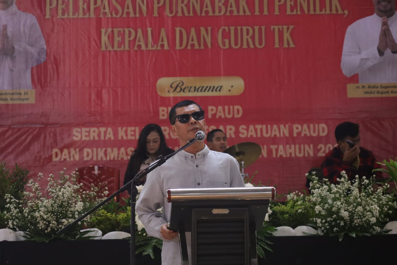 KUNINGAN- Bupati Kuningan, H. Acep Purnama, SH., MH., menghadiri acara Pelepasan Purna Bakti Penilik PAUD, Kepala dan Guru Taman Kanak-Kanak (TK) se Kabupaten Kuningan Tahun 2023, yang berlangsung di GOR Ewangga Kuningan, Sabtu (29/4/2023).