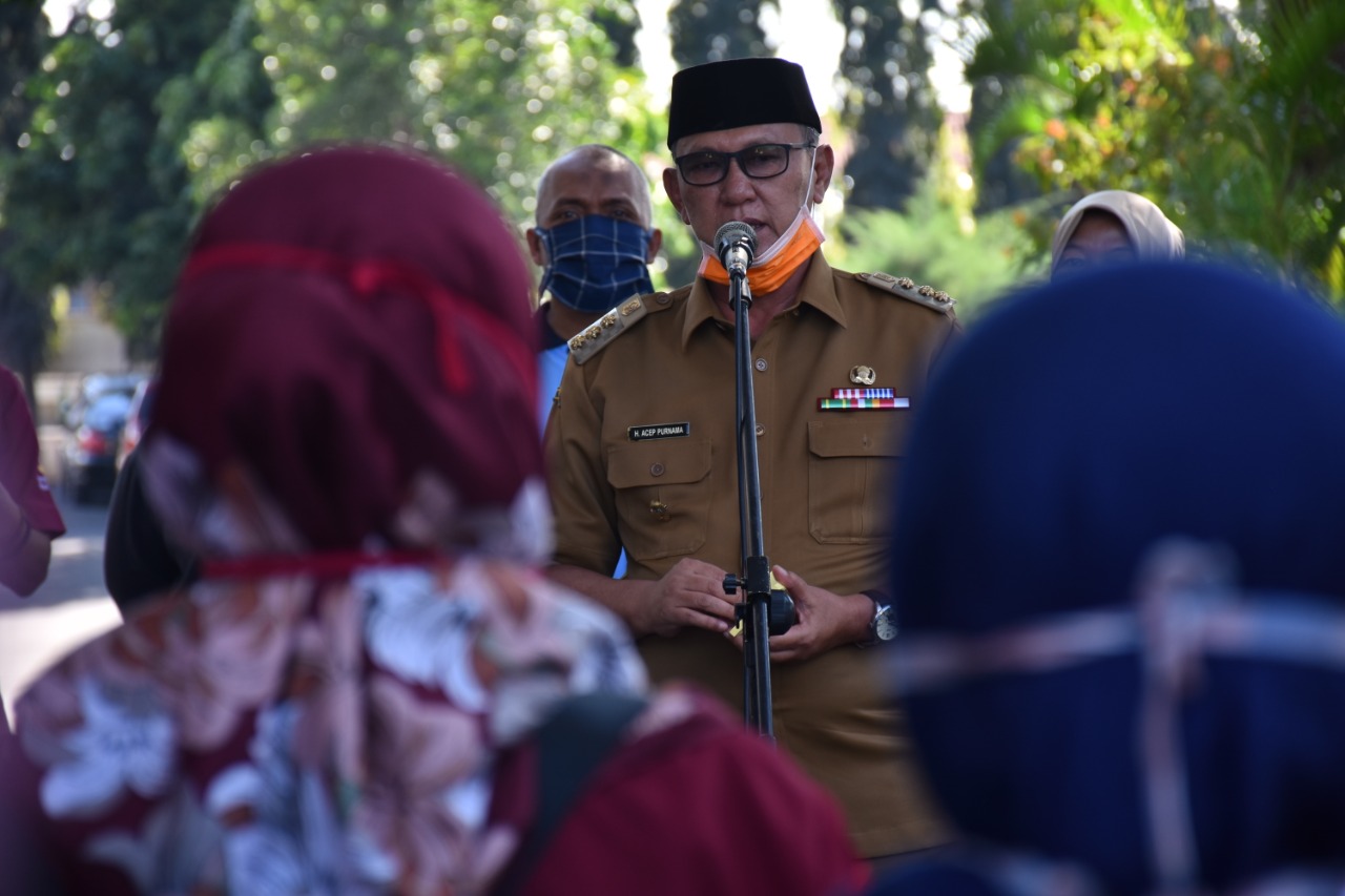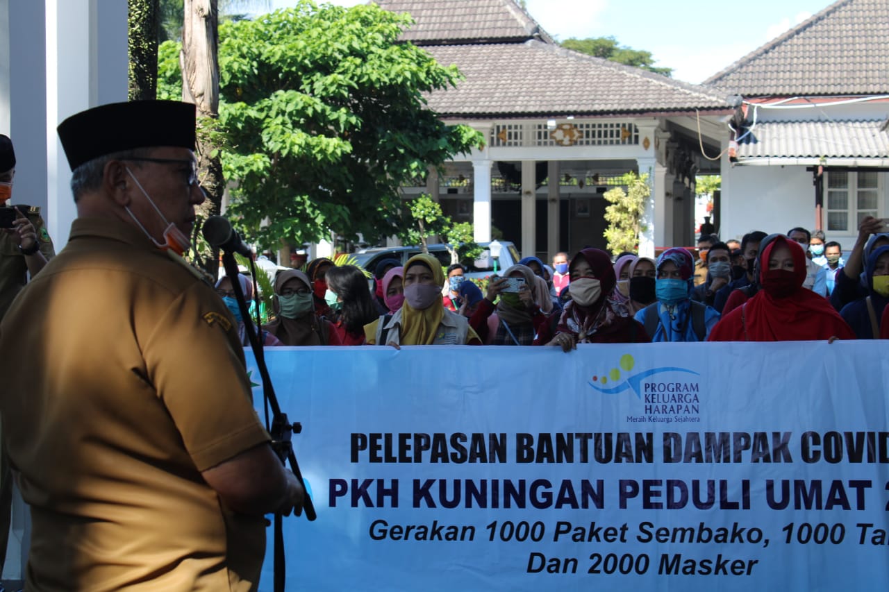KUNINGAN,- Bupati Kuningan, H. Acep Purnama, SH., MH, melepas penyaluran bantuan PKH Kuningan Peduli Ummat 2020, Senin (11/5/2020) di halaman Setda Kuningan. Kegiatan tersebut juga dihadiri, Sekretaris Daerah, DR.H. Dian Rachmat Yanuar, Kepala Dinas Sosial, Kepala Pelaksana BPBD, serta Camat Kuningan.