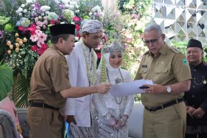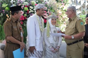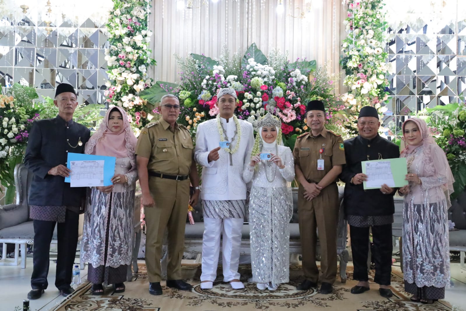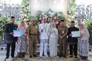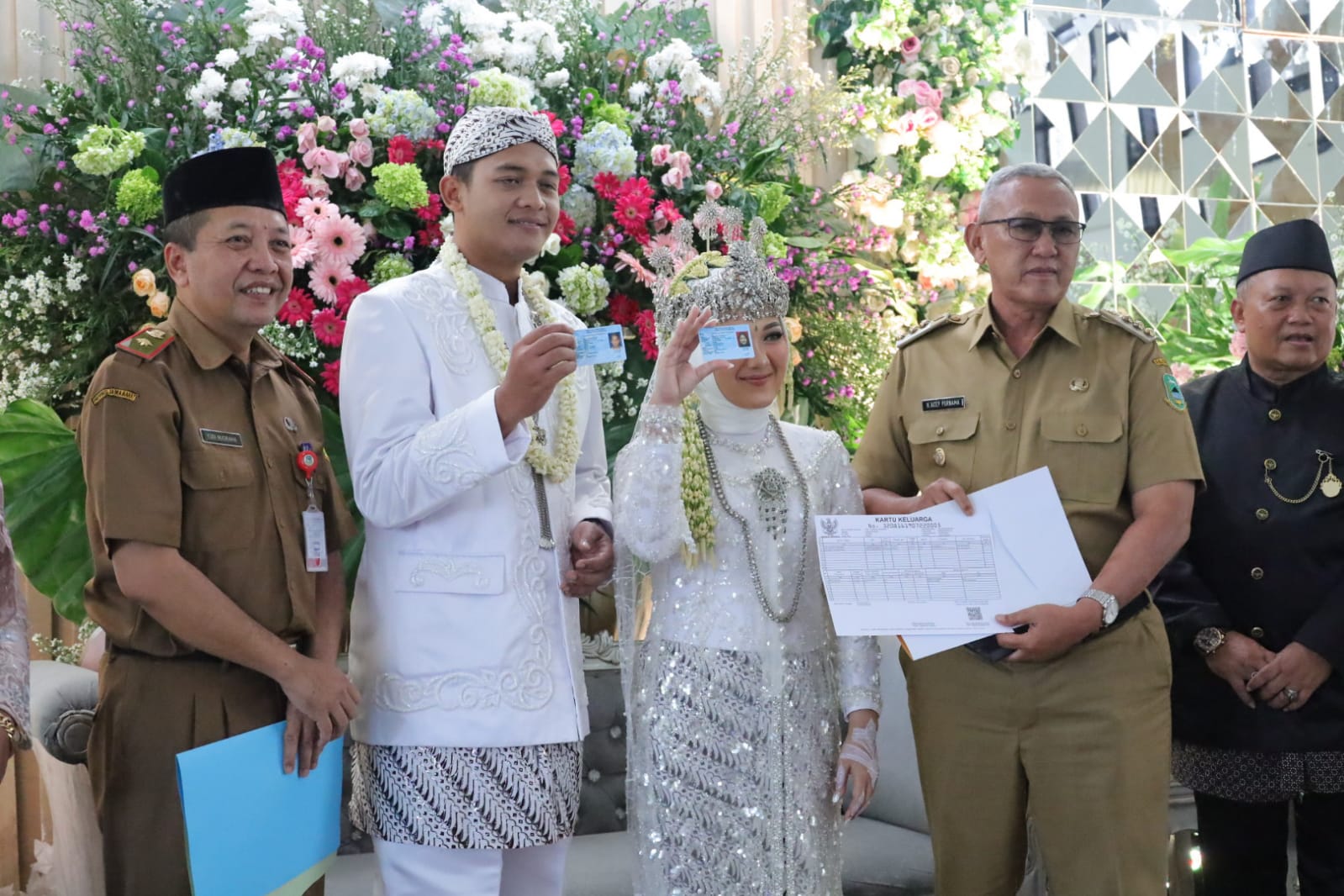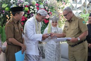 KUNINGAN, – Bertempat di Lembah Ciremai Restaurant, Jalan Raya Kuningan Cirebon , Cibentang, Kec. Kramatmulya, Kabupaten Kuningan, Senin (25/7/2022). Usai Akad Nikah Pasangan Oca dan Giri, Bupati Kuningan H. Acep Purnama, SH.,MH menyerahkan dua buah KTP dan Kartu Keluarga (KK) kepada kedua mempelai disaksikan oleh Kadisdukcapil Kepala Disdukcapil Drs. Yudi Nugraha, Mp.Pd sebagai Tanda Program Pelayanan Administrasi Kependudukan Untuk Perkawinan (PADUKA) dari Catatan Sipil (Disdukcapil) Kabupaten Kuningan.