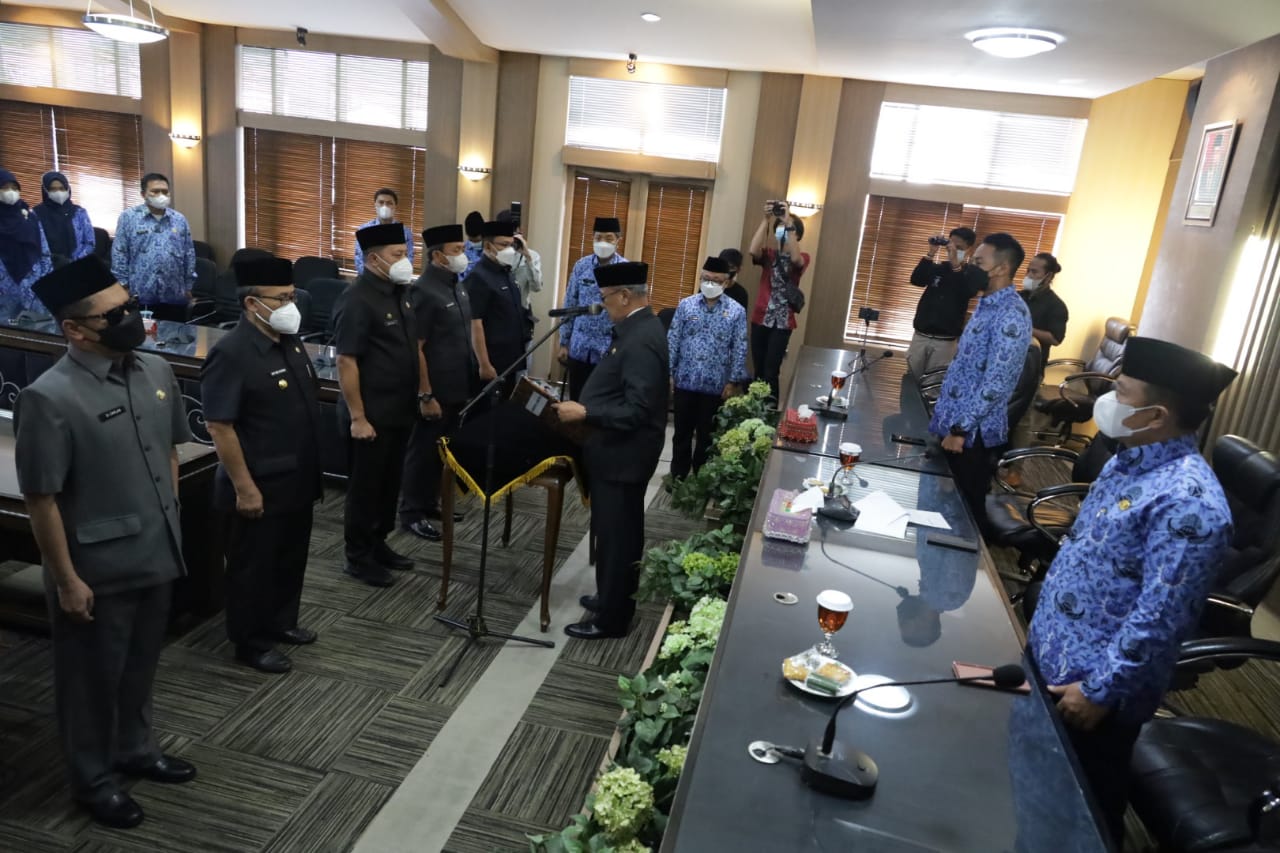 KUNINGAN,- Bupati Kuningan H. Acep Purnama SH., MH. resmi lantik 6 pejabat sekaligus Pengambilan Sumpah Jabatan Pimpinan Tinggi Pratama di Lingkungan Pemerintah Kabupaten Kuningan bertempat di Ruang Linggarjati Setda Kuningan, Jumat (17/12/2021). Turut hadir dalam acara tersebut Wakil Bupati Kuningan H. M Ridho Suganda, SH., M.Si, Sekretaris Daerah Kab. Kuningan Dr. H. Dian Rachmat Yanuar, Para Asisten, Staf Ahli dan Kepala Satuan Kerja Perangkat Daerah se-Kabupaten Kuningan, Rekan-Rekan Wartawan Media Cetak dan Elektronik, serta Para tamu lainnya.