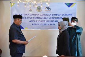 KUNINGAN-Usai melalui tahapan-tahapan yang diujikan dan diikuti oleh beberapa calon direktur. Akhirnya Bupati Kuningan H. Acep Purnama, MH selaku Kuasa Pemilik Modal (KPM) selaku bupati menetapkan, lalu melantik dan mengambil sumpah jabatan Direktur Perumda Aneka Usaha (Perumda AU) Kuningan terpilih Periode 2022-2027, Hj. Heni Susilawati, S.Sos, MM. bertempat di Ruang Kerja Bupati, Jumat (29/07/2022).