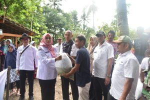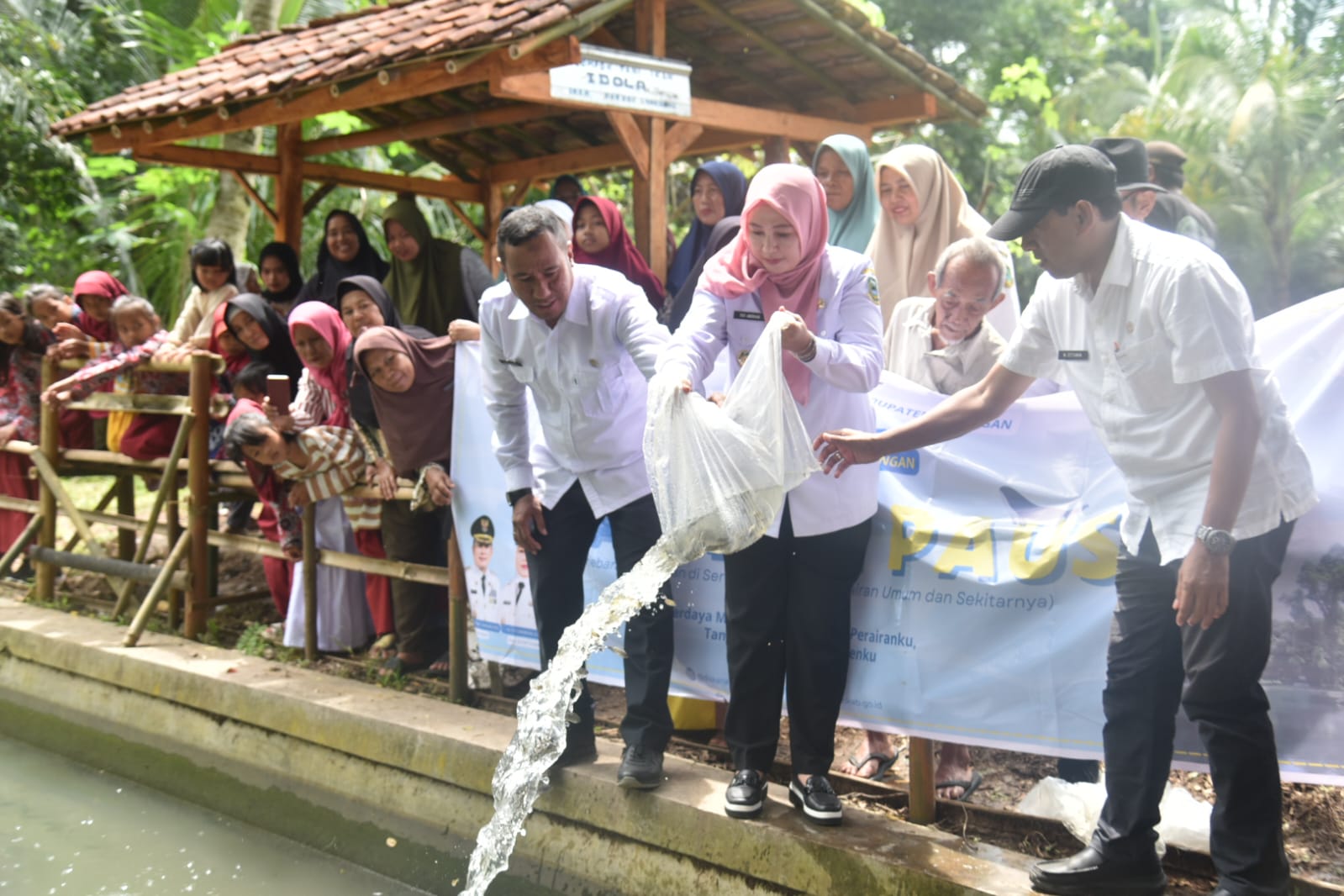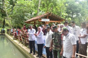 KUNINGAN – Wakil Bupati Kuningan, Tuti Andriani, SH., M.kn, bersama Dinas Perikanan dan Peternakan Kabupaten Kuningan menebar Benih Ikan di Embung Idola Desa Margamukti Kecamatan Cimahi. Rabu (12/03). Kegiatan yang diberi nama Gebyar Pasukan Paus (Penebaran Benih Ikan di Seratus Titik Perairan Umum dan Sekitarnya) ini merupakan wujud dari 100 hari program kerja Bupati dan Wakil Bupati Kuningan.