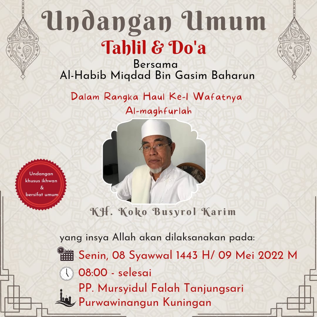KUNINGAN,- Bupati Kuningan H. Acep Purnama hadiri Haul Ke-1 Al-maghfurlah Al Walid KH. Koko Busyrol Karim bertempat di PP. Mursyidul Falah Tanjungsari, Purwawinangun, Kuningan, Senin (09/05/2022).