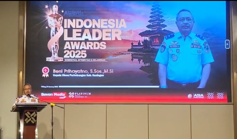KUNINGAN – Kepala Dinas Perhubungan Kabupaten Kuningan, Beni Prihayatno, S.Sos., M.Si., berhasil meraih penghargaan bergengsi kategori The Most Promising Indonesia 2025 Kolaborasi, Sinergi, dan Integritas di ajang “Indonesia Leader Awards 2025”. Atas inovasi dalam meningkatkan pelayanan di bidang perhubungan.