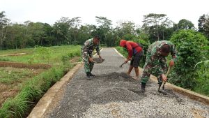 KUNINGAN- Sebagai wujud manunggalnya TNI bersama rakyat, Kodim 0615/Kuningan, bekerjasama dengan Dinas Pemberdayaan Masyarakat dan Desa (DPMD) Kabupaten Kuningan, melaksanakan pembangunan jalan usaha tani (JUT) melalui kegiatan Karya Bakti TNI tahun 2023, berlokasi di Dusun Kliwon, Desa Padarek, Kecamatan Kuningan, Sabtu (2/12/2023).