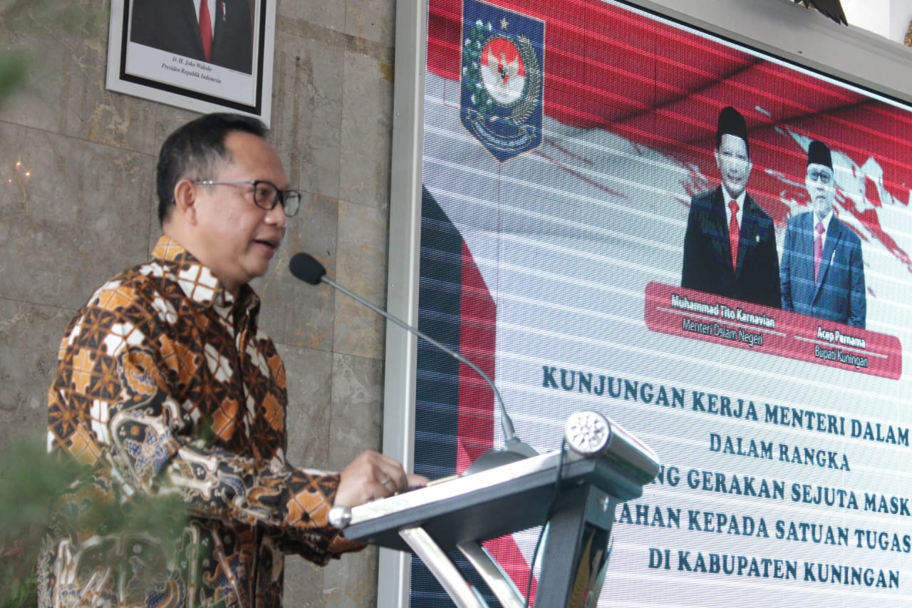 KUNINGAN – Gerakan bagi masker dan sosialisasi menggunakan masker yang benar sebagai salah satu dari protokol kesehatan secara masif gerak cepat terus dikampanyekan dan disosialisasikan ke jajaran pemerintah daerah. Untuk itu, Menteri Dalam Negeri Muhammad Tito Karnavian menghadiri launching pembagian 1,2 juta masker di Kabupaten Kuningan, Sabtu (15/08/2020).