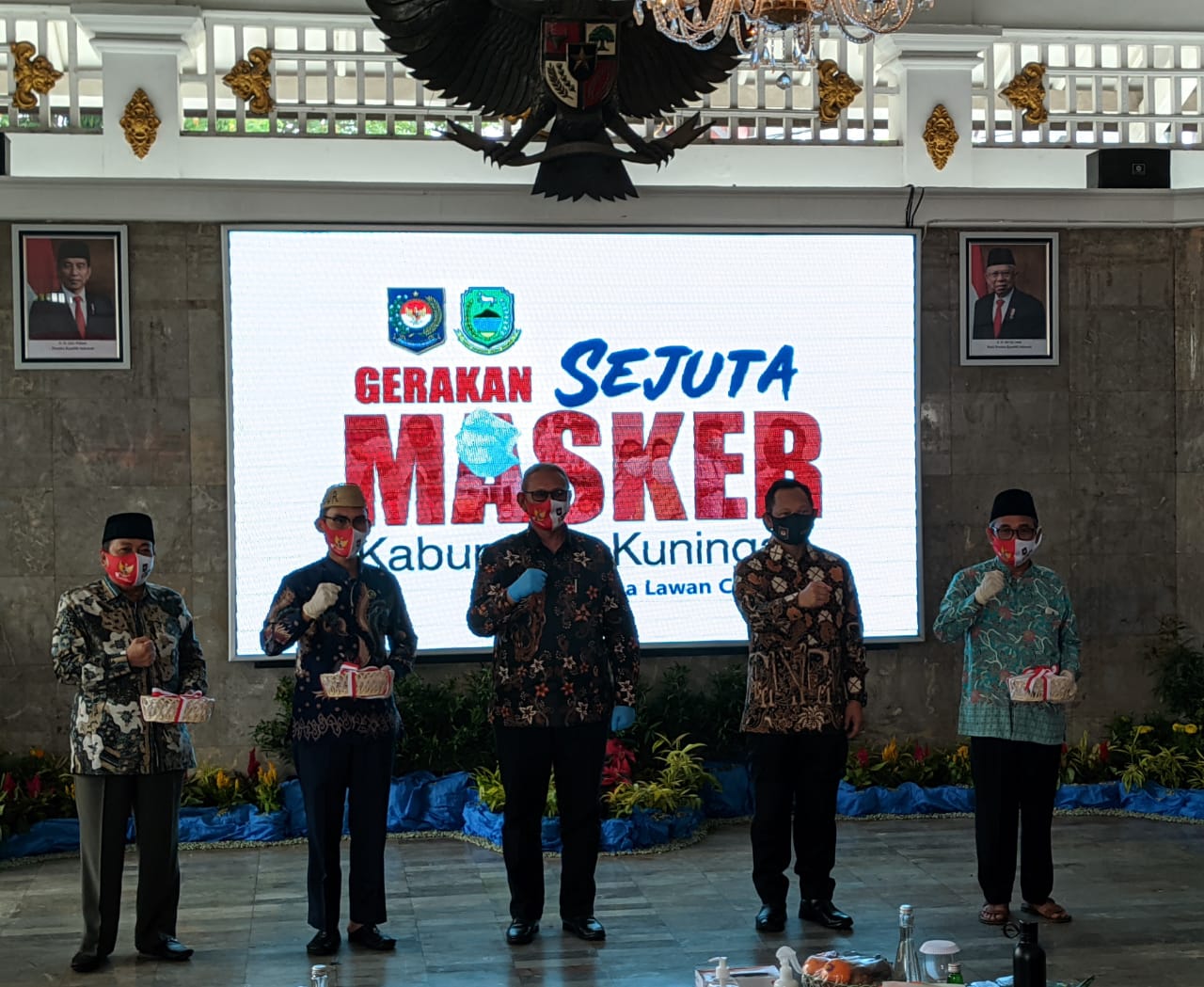 Bupati Kuningan menjelaskan bahwa Program gerakan sejuta masker di canangkan dimana pemakaian masker yang tepat menjadi cara efektif untuk mencegah dan menekan penyebaran virus covid-19, selain itu juga gerakan ini merupakan salah satu bentuk mendukung program nasional dalam memutus mata rantai covid -19. kami harapkan penggunaan masker ini dapat dibudayakan dan menjadi adaptasi kebiasaan baru di kabupaten kuningan agar penularan covid-19 dapat diminimalisir.