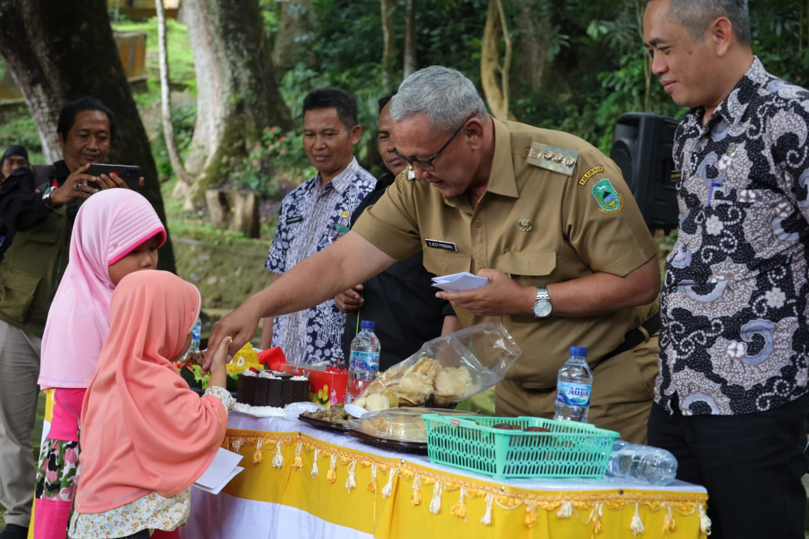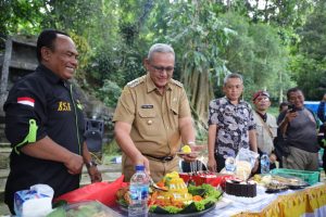 Pada kesempatan tersebut, selain santunan anak Yatim dalam rangka Milad Ke-1 BSK (Batur Sauyunan Kuningan) juga dilakukan pemotongan nasi tumpeng oleh Bupati Acep Purnama secara simbolis. (Bid IKP/Diskominfo).