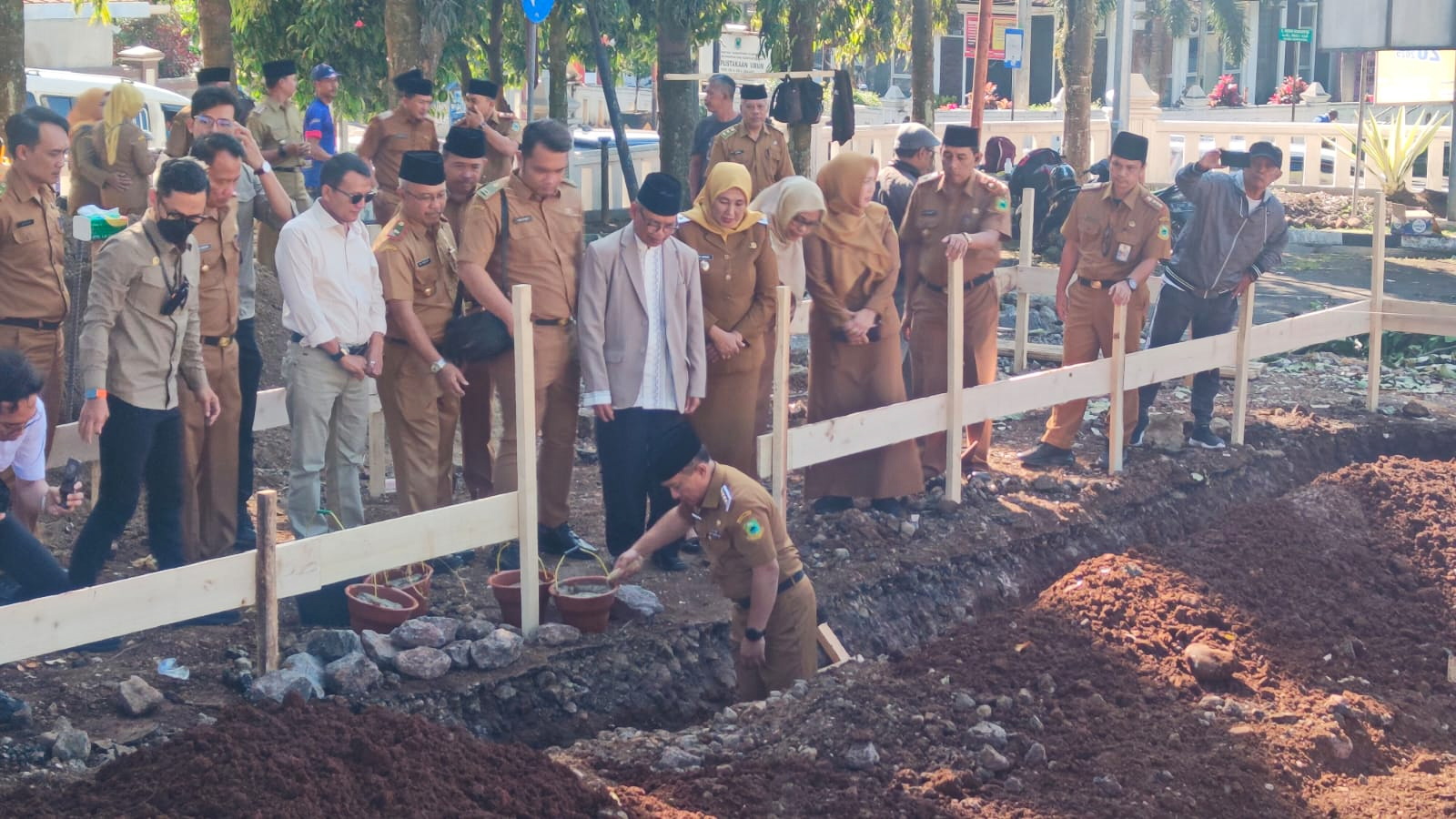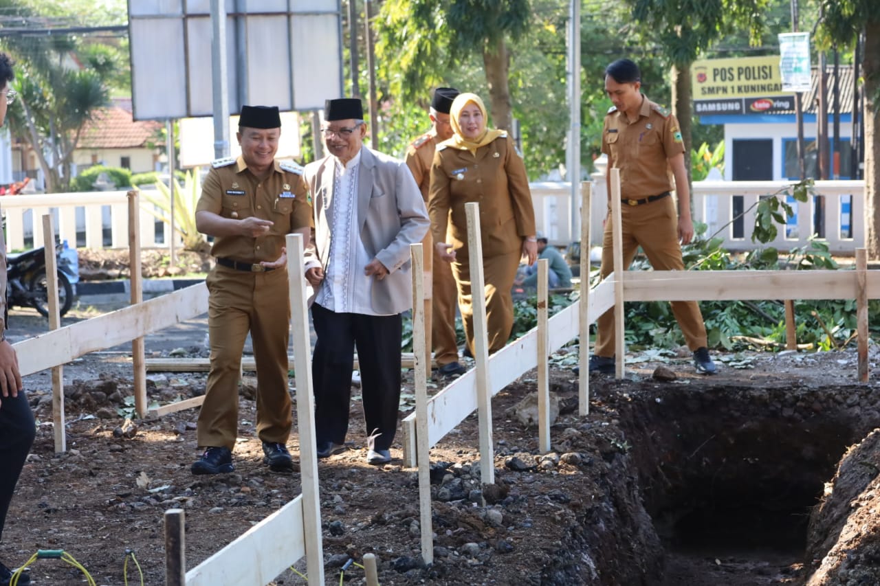 Acara peletakan batu pertama turut dihadiri Wakil Bupati Kuningan Hj. Tuti Andriani, S.H., M.Kn, Pj Sekda Kuningan Beni Prihayatno, S.Sos., M.Si, para staf ahli, kepala perangkat daerah, Ketua MUI Kuningan, Camat Kuningan, Lurah Purwawinangun, dan tokoh masyarakat.