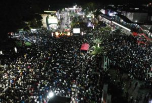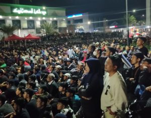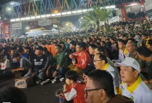KUNINGAN – Ribuan warga Kuningan nampak membludak memadati area Taman Kota Kuningan yang jadi venue Nobar Timnas Indonesia U-23, Senin (29/5/2024) malam yang diselenggarakan Pemkab Kuningan.