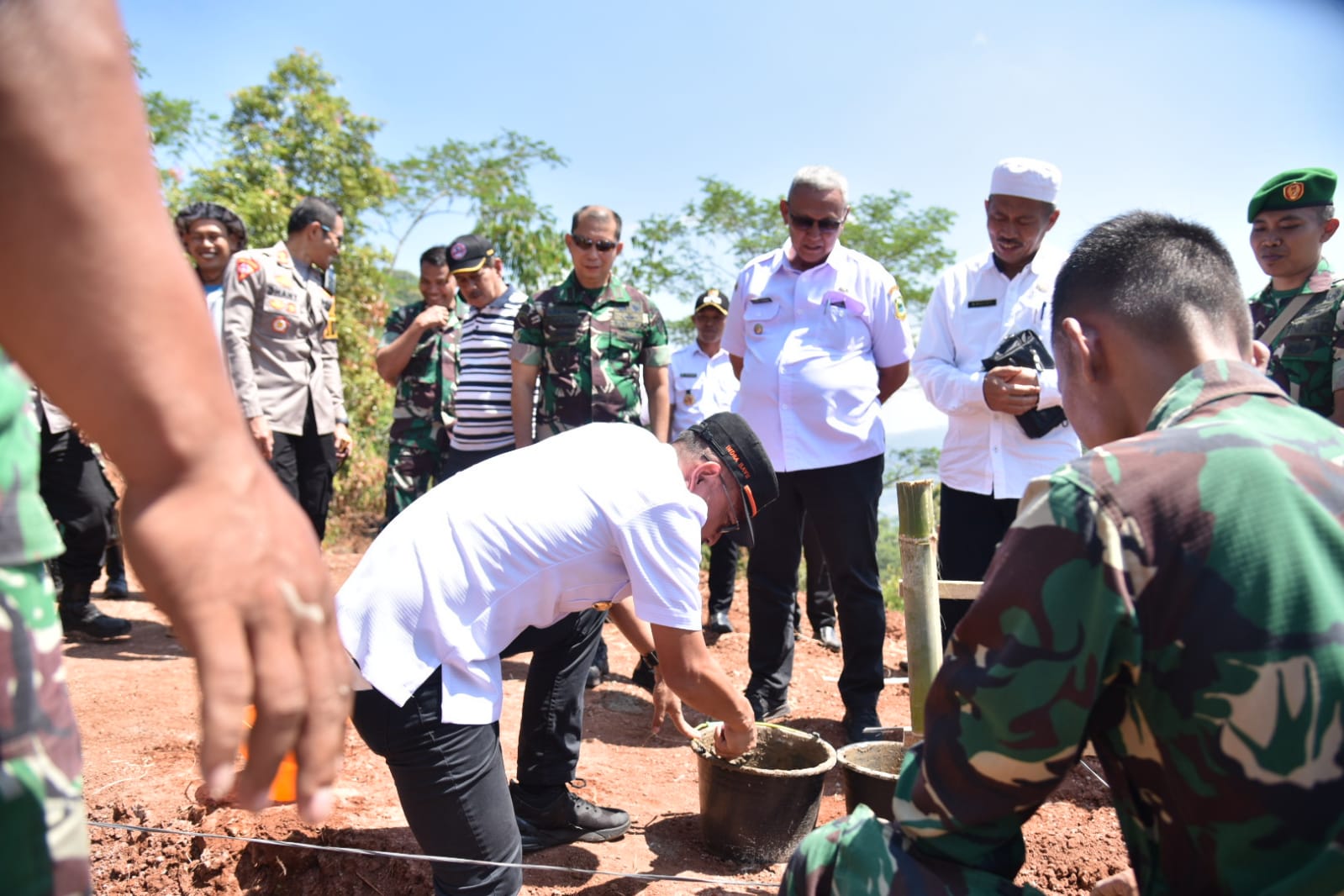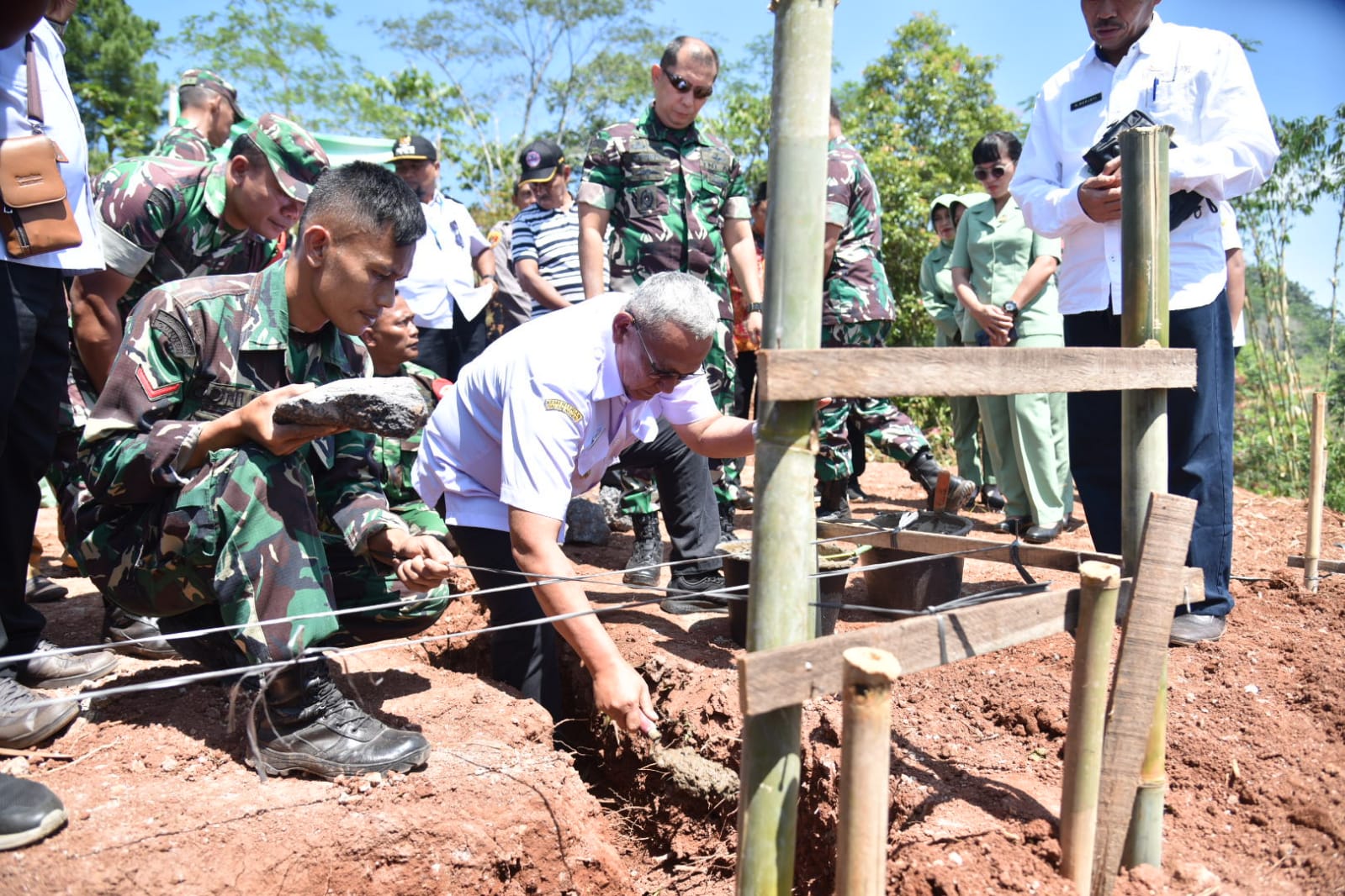 KUNINGAN,- Bupati Kuningan H. Acep Purnama SH MH bersama Komandan Korem 063/SGJ, Kolonel Infanteri Dany Rakca Andalasawan, Komandan Kodim 0615/Kuningan Letkol CZI David Nainggolan Letakan Batu Pertama tandai Pembangunan Masjid Syekh Mansyur di area lokasi Agrowisata yang dibuka akses jalan nya oleh Dandim David di Desa Sindangjawa, Kecamatan Kadugede, Kabupaten Kuningan, Rabu (27/7/2022).