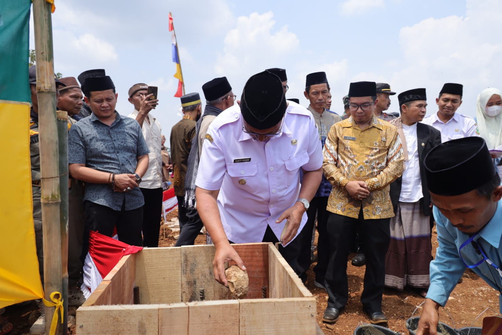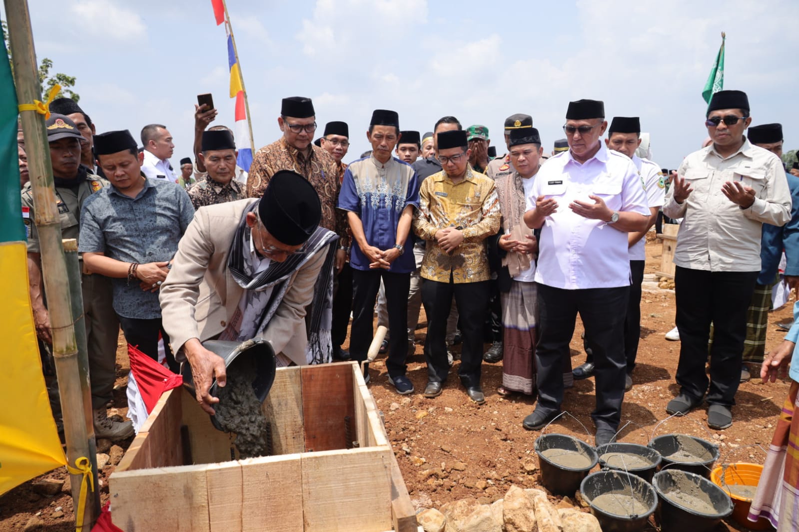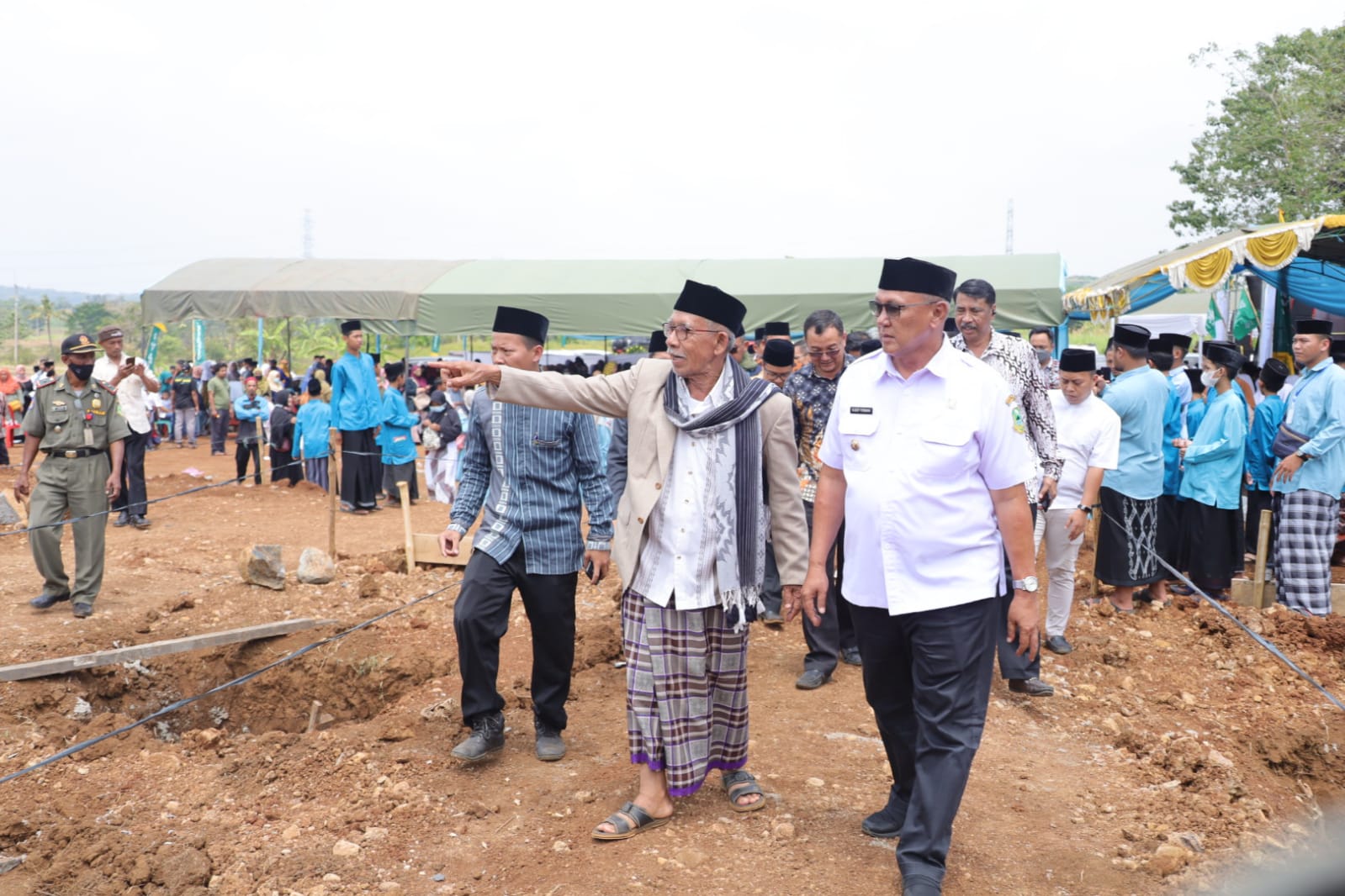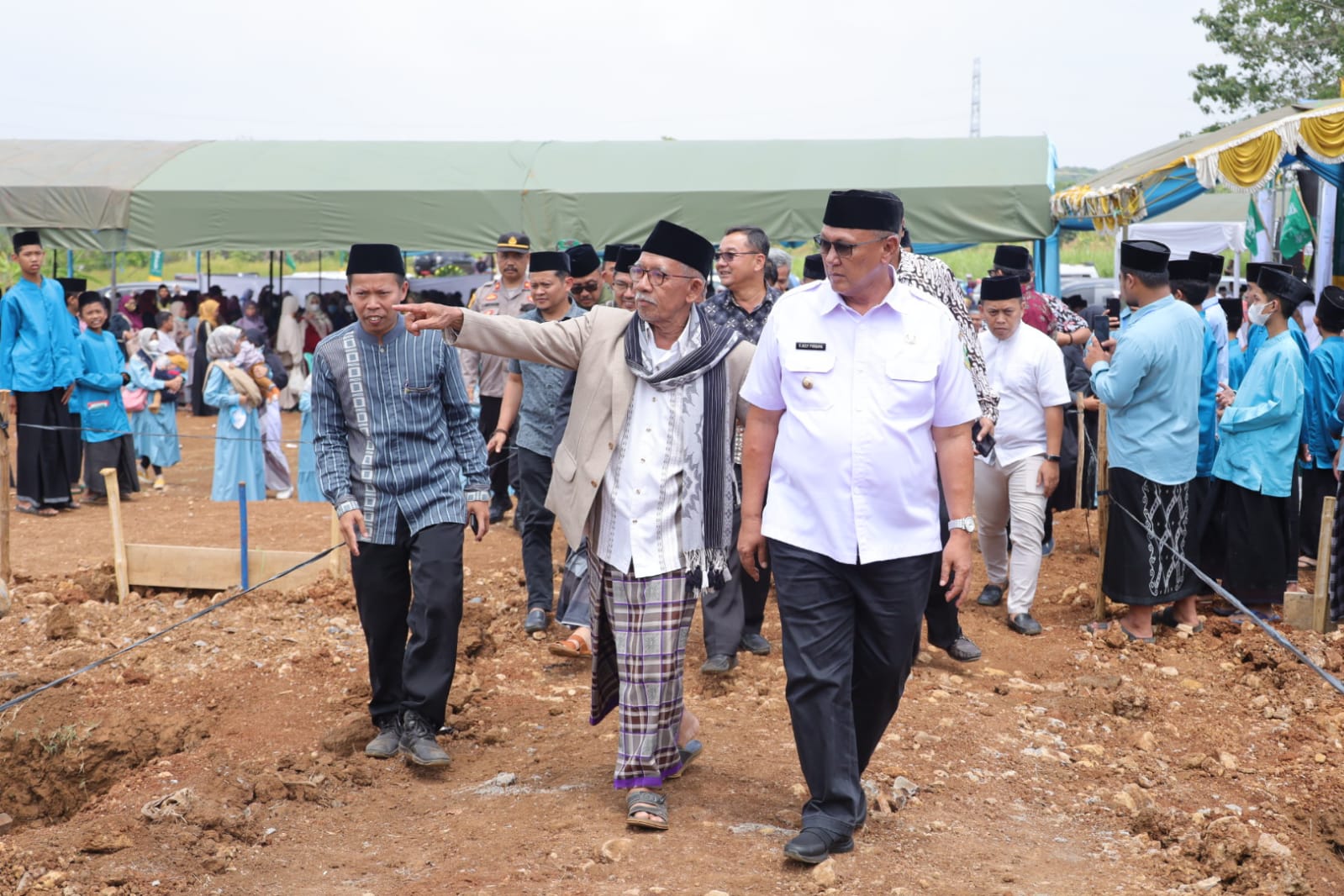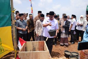 KUNINGAN, – Bupati Kuningan H. Acep Purnama SH.,MH bersama Pendiri dan Pengasuh PonPes Al-mutawally Drs KH Nunung Abdullah Dunun, meletakan Batu Pertama Pembangunan Masjid “Zainal ‘Abidin” Kampus II Pesantren Terpadu Kulliyatul Mu’allimin Al- Mutawally di Kampus II KMA Desa Patalagan Kecamatan Pancalang Kab. Kuningan, Rabu (7/9/2022).