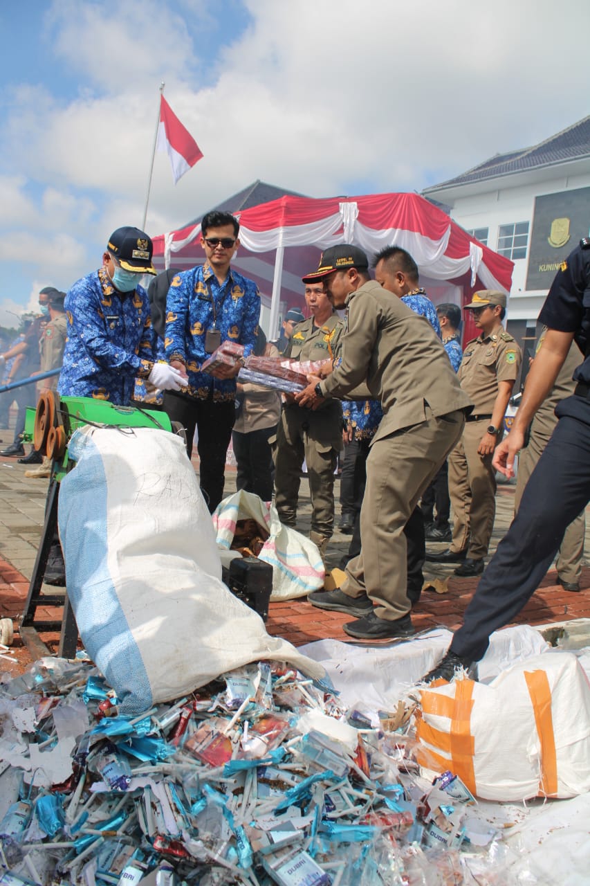 KUNINGAN – Pemerintah Kabupaten Kuningan bersama Kantor Pengawasan dan Pelayanan Bea dan Cukai (KPPBC) Tipe Madya Pabean C Cirebon melakukan pemusnahan barang hasil Penindakan se-Ciayumajakuning, berupa rokok ilegal sebanyak 7.233.417 batang.