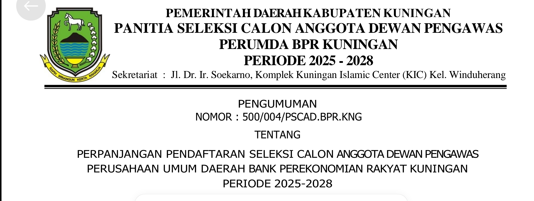 Perpanjangan ini mengacu pada Peraturan Bupati Kuningan Nomor 17 Tahun 2019 tentang Tata Cara Seleksi dan Pengangkatan Anggota Direksi dan Anggota Dewan Pengawas Perumda BPR Kuningan. Dalam aturan tersebut disebutkan, apabila jumlah bakal calon Dewan Pengawas kurang dari tiga orang, panitia seleksi wajib membuka perpanjangan pendaftaran.