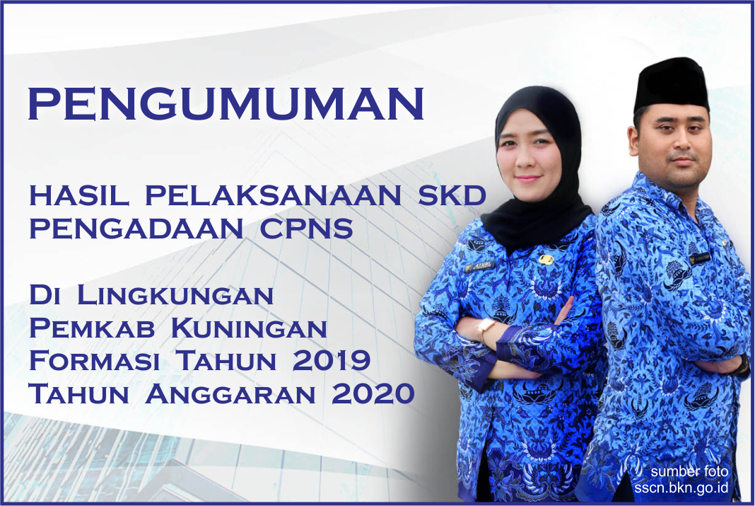 Berikut terlampir Hasil Pelaksanaan Seleksi Kompetensi Dasar (SKD) Pengadaan Calon Pegawai Negeri Sipil (PNS) Di Lingkungan Pemerintah Kabupaten Kuningan Formasi Tahun 2019 Tahun Anggaran 2020