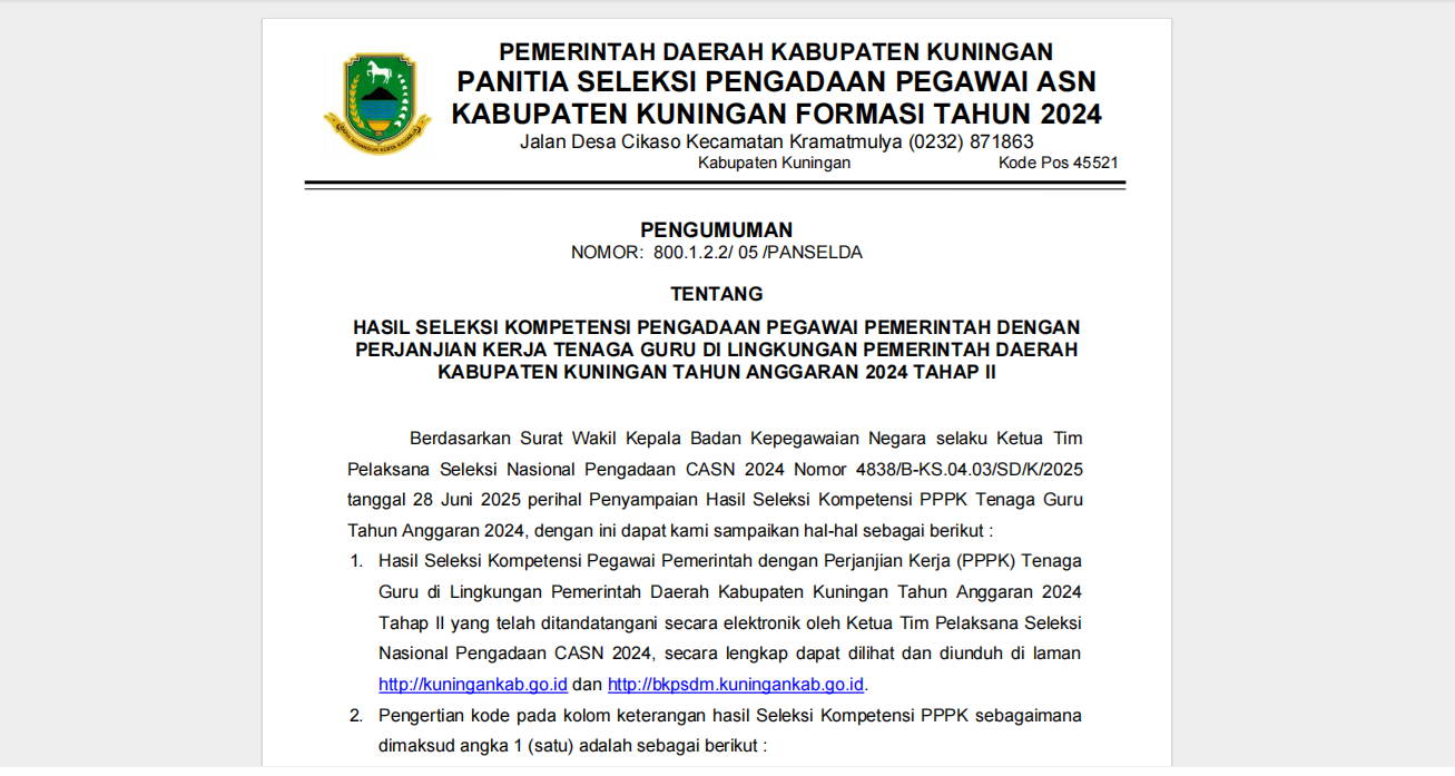 - Pengumuman Hasil Seleksi PPPK Tenaga Guru Tahun 2024 Tahap II Di Lingkungan Pemerintah Kab Kuningan. (Download Disini)