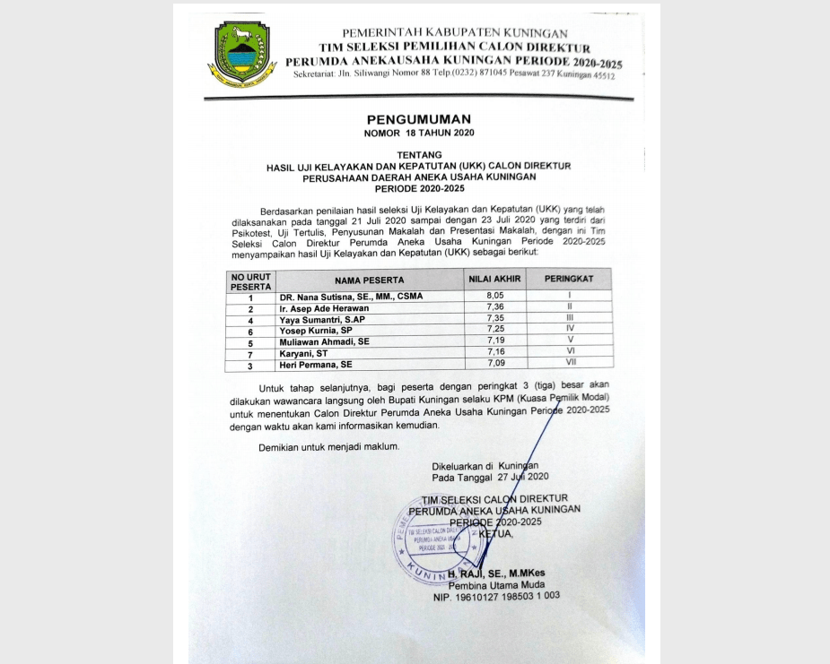 Berdasarkan penilaian hasil seleksi uji kelayakan dan kepatuhan (UKK) yang telah dilaksanakan pada tanggal 21 Juli 2020 sampai dengan 23 Juli 2020 yang terdiri dari psikotes, uji tertulis, penyusunan makalah dan presentasi makalah, dengan ini Tim Seleksi Calon Direktur Perumda Aneka Usaha Kuningan periode 2020-2025 menyampaikan hasil uji kelayakan dan kepatuhan (UKK) sebagai berikut.