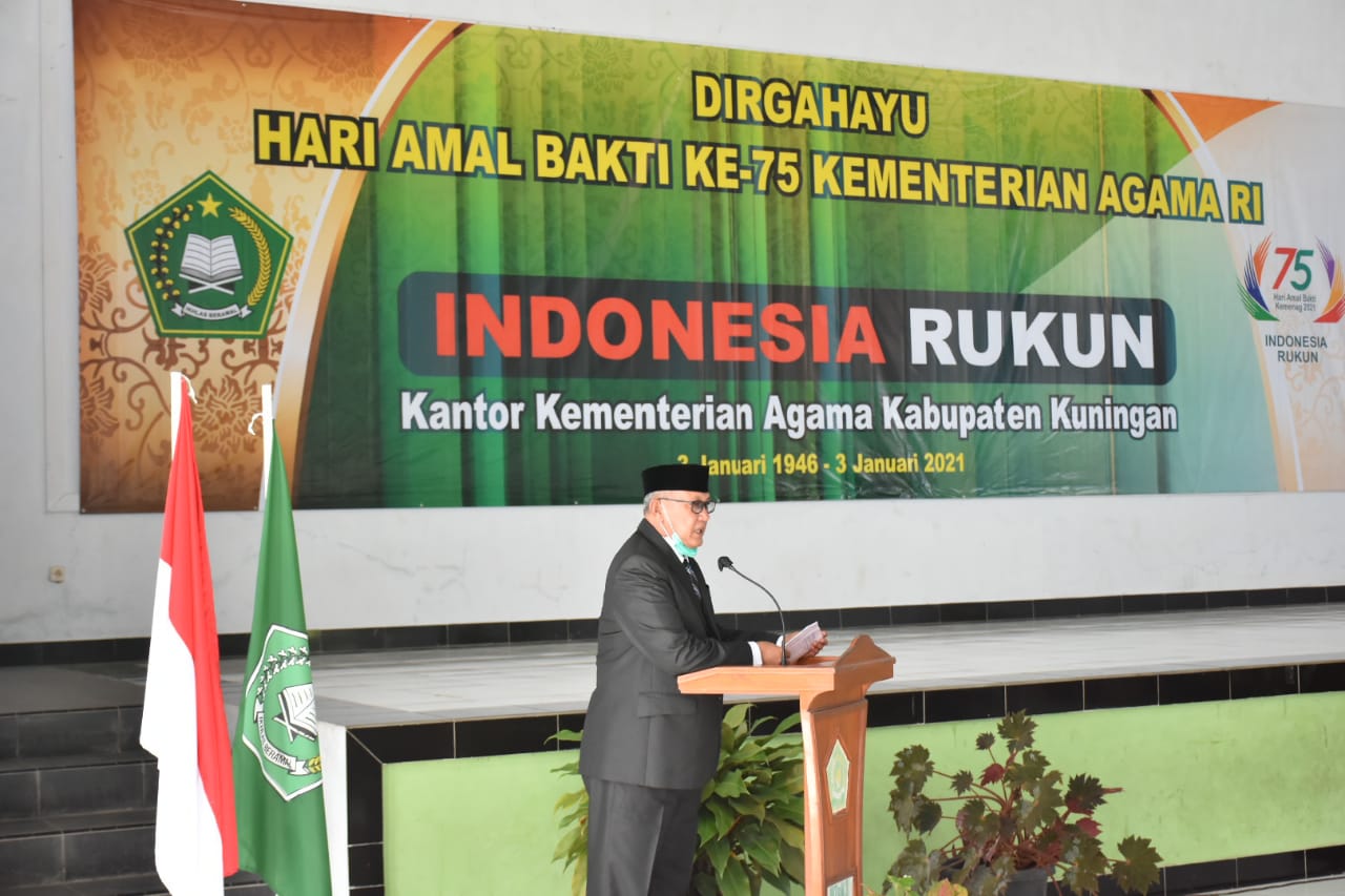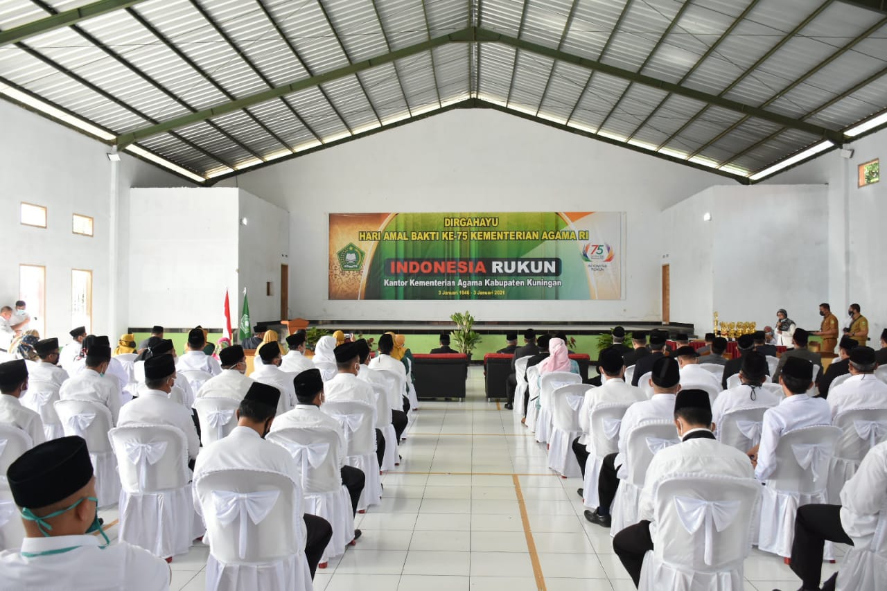 KUNINGAN-, Dalam rangka menerapkan sikap toleransi dan saling mendukung antarumat beragama, Bupati Kuningan H. Acep Purnama, SH., MH hadiri Peringatan Hari Amal Bakti (HAB) Kementerian Agama Republik Indonesia yang mengusung tema “Indonesia Rukun”, di Aula MTSN 3 Kuningan, Selasa (5/1/2021). Kegiatan ini sejalan dengan semangat nasional yang menempatkan kerukunan umat beragama sebagai salah satu modal bangsa ini untuk maju.