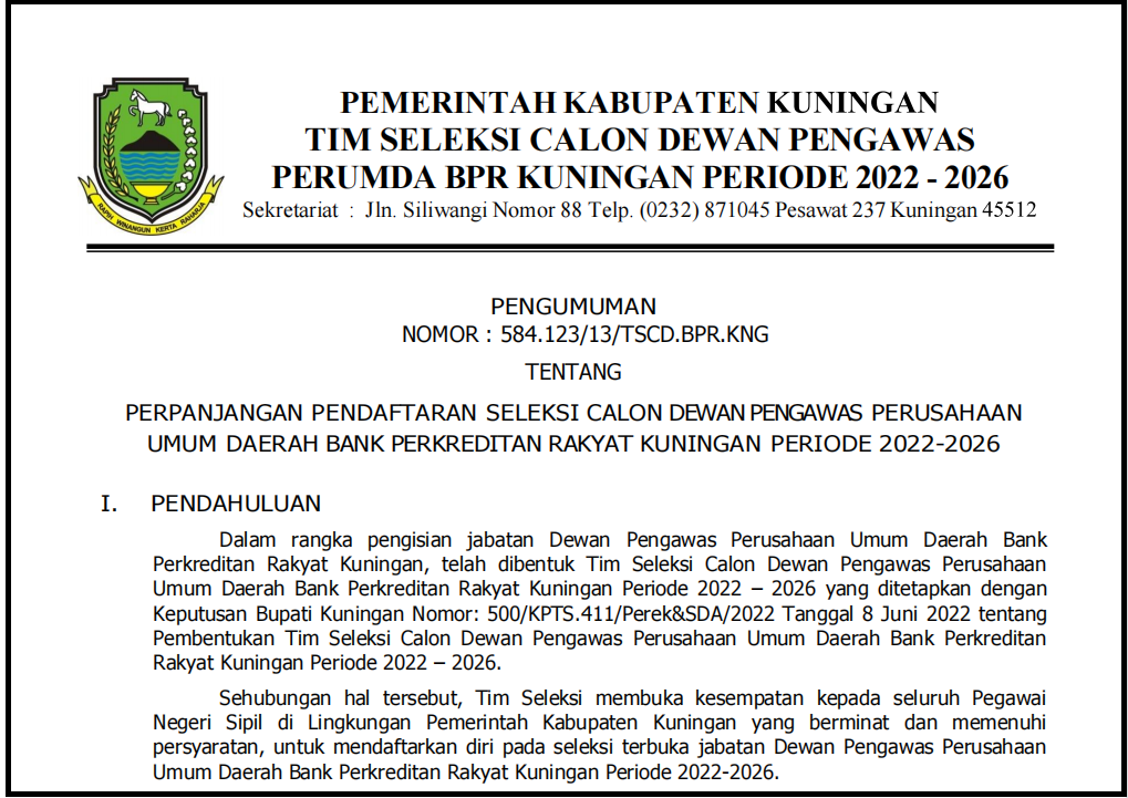 Sehubungan hal tersebut, Tim Seleksi membuka kesempatan kepada seluruh Pegawai Negeri Sipil di Lingkungan Pemerintah Kabupaten Kuningan yang berminat dan memenuhi persyaratan, untuk mendaftarkan diri pada seleksi terbuka jabatan Dewan Pengawas Perusahaan Umum Daerah Bank Perkreditan Rakyat Kuningan Periode 2022-2026.