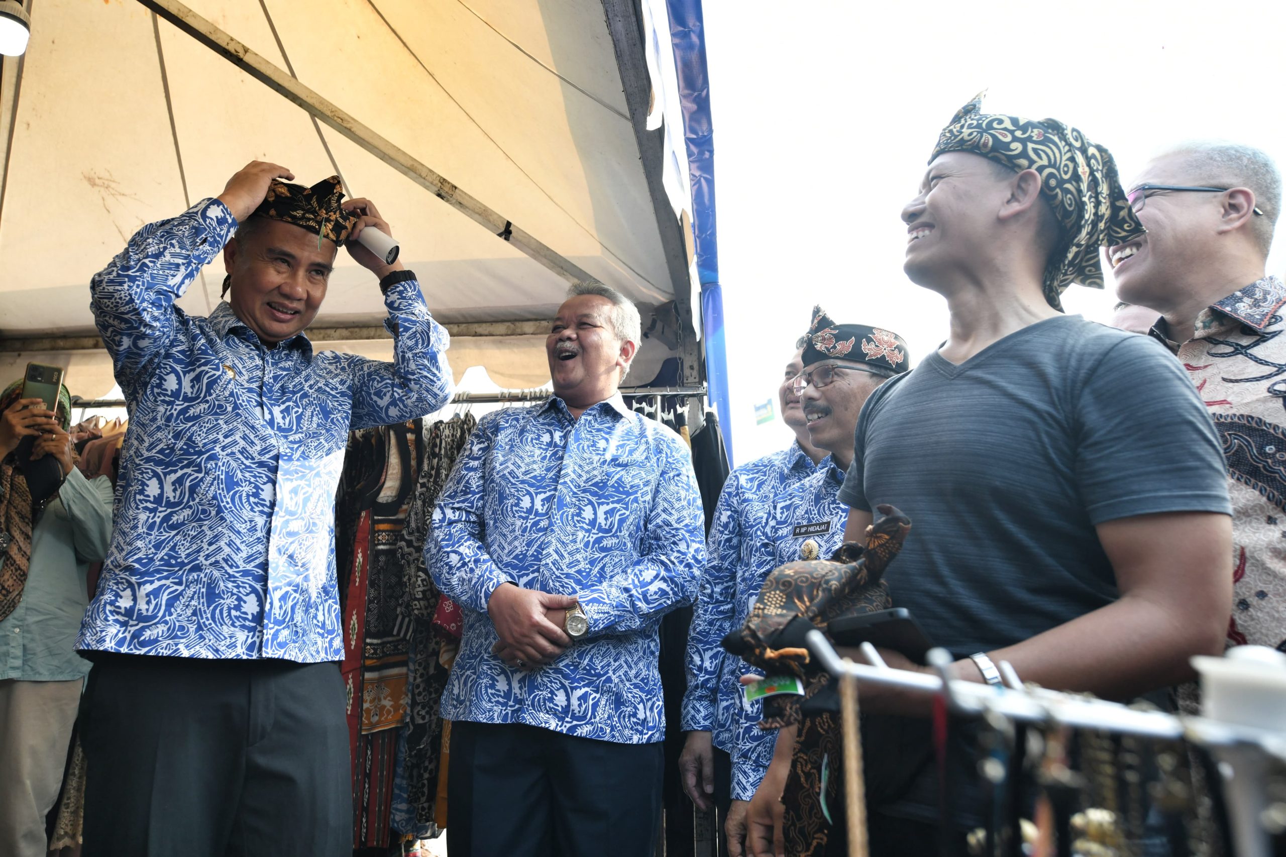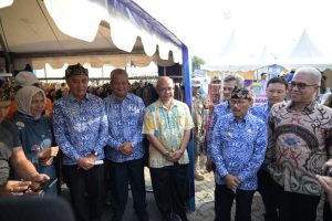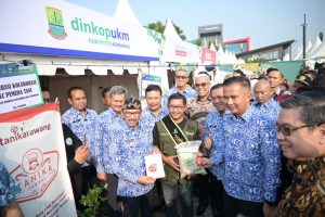 Turut mendampingi, Ketua TP PKK Kuningan, Hj Susi Widyawati, S.Sos.,M.Ip dan Kepala Dinas Koperasi, UKM, Perdagangan dan Perindustrian Kabupaten Kuningan, Trisman Supriatna, Spd.,Mpd.