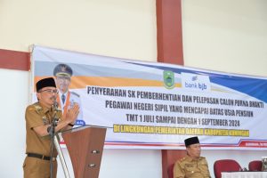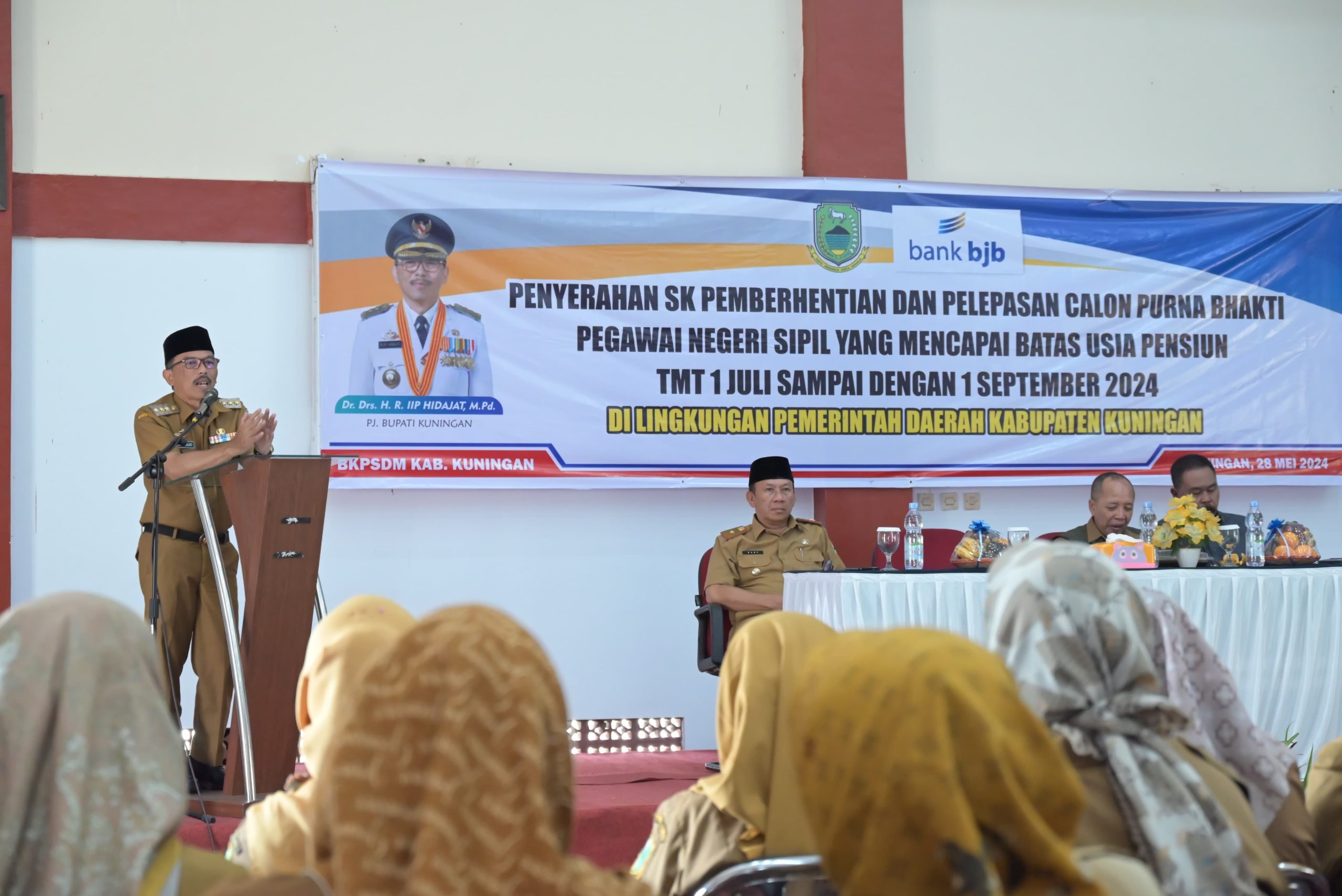 KUNINGAN – Ada total sebanyak 175 Pegawai Negeri Sipil menerima SK Pemberhentian yang Terhitung Mulai Tanggal (TMT) 01 Juli sampai dengan 01 September 2024 yang akan purna tugas. Diserahkan Surat Keputusan Pemberhentiannya secara langsung oleh Penjabat Bupati Kuningan, Dr. Drs. H. Raden Iip Hidajat, mpd pada Selasa (28/05/2024) bertempat di Aula Graha Sajati BPKSDM Kuningan.
