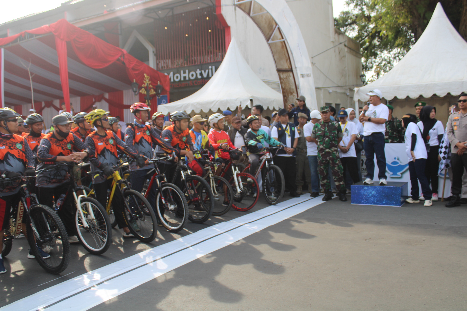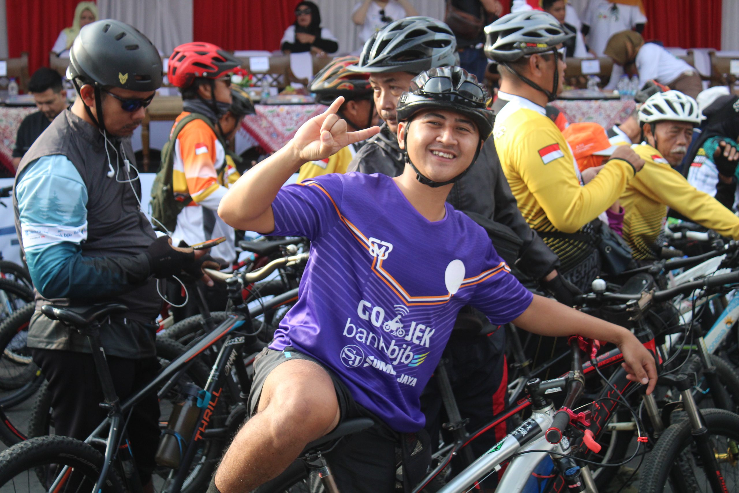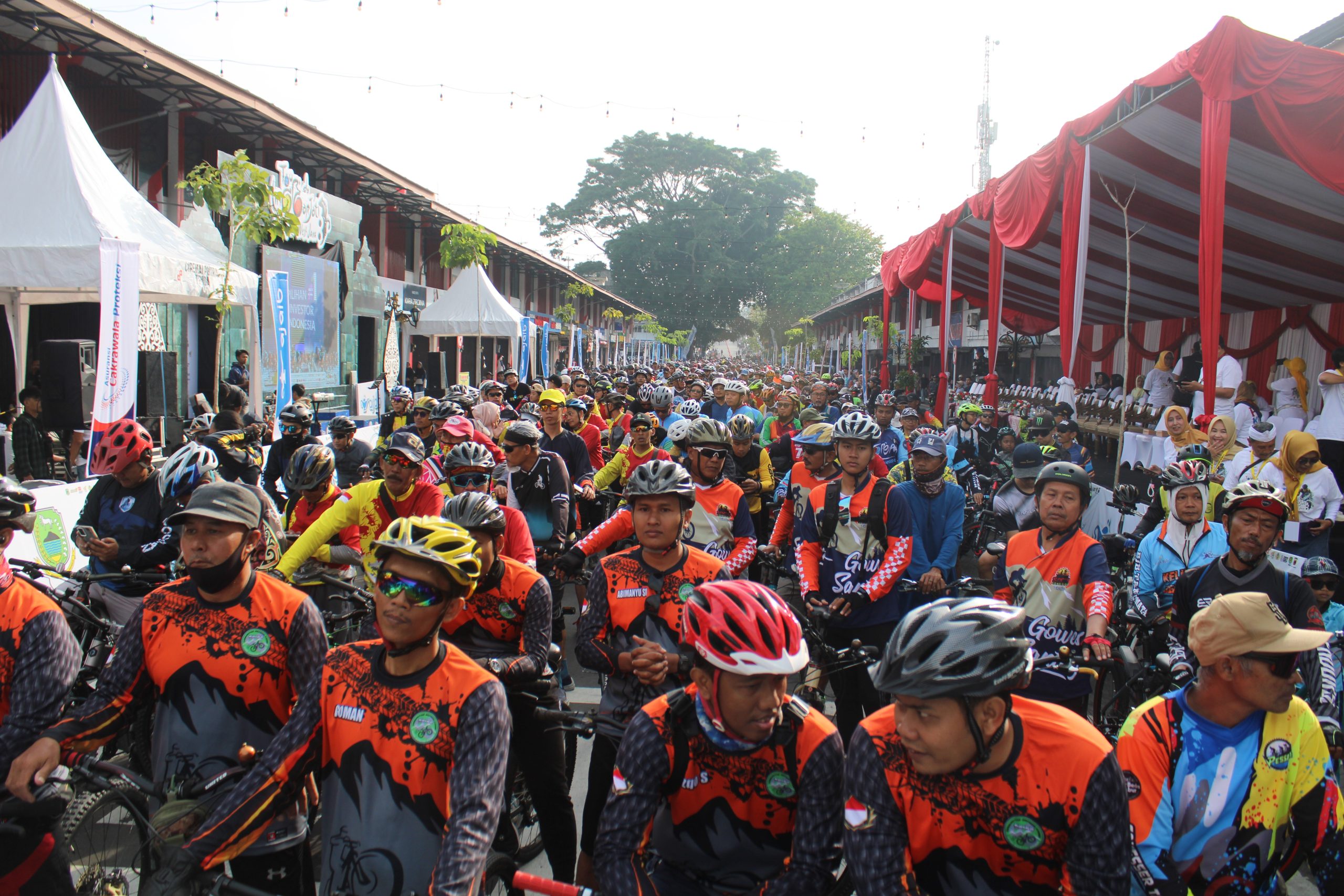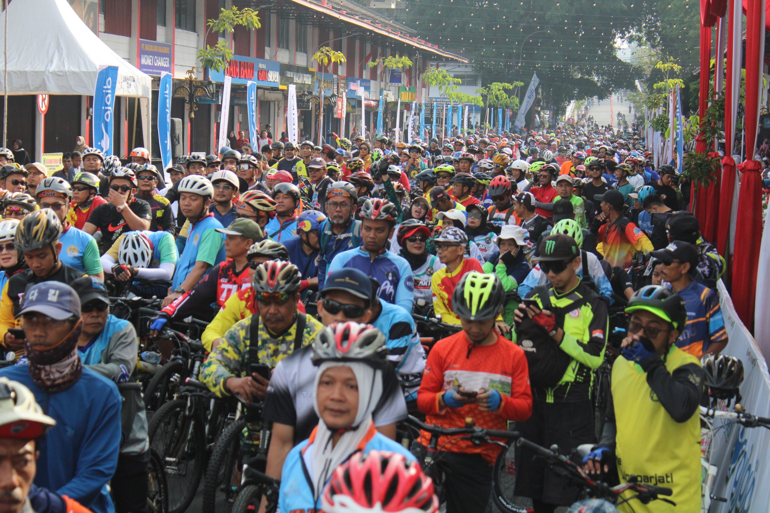 Sejak pagi, peserta dari berbagai daerah—bahkan dari luar Pulau Jawa—mulai memenuhi titik kumpul. Kostum warna-warni, atribut unik, dan senyum ceria mewarnai pelepasan yang dilakukan langsung oleh Bupati Kuningan, Dr. H. Dian Rachmat Yanuar, M.Si. Bersama jajaran pejabat daerah, ia melepas ribuan pesepeda yang antusias menaklukkan rute sambil menikmati panorama Kuningan yang asri.