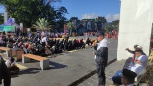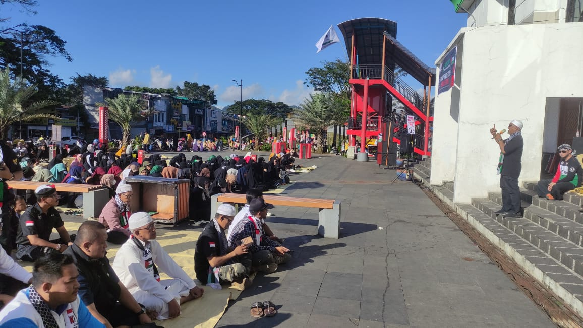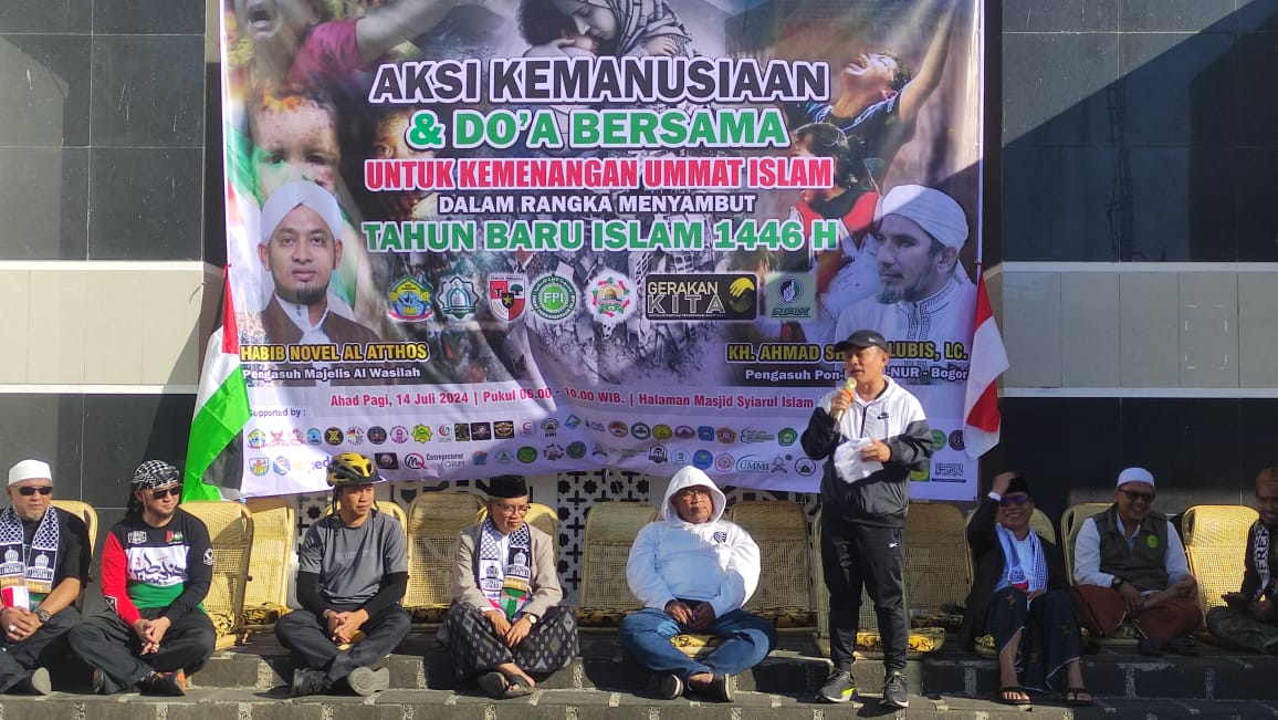 KUNINGAN – Dalam rangka menyambut Tahun Baru Islam 1446 H, ratusan warga Kabupaten Kuningan berkumpul di halaman Masjid Syi’arul Islam mengikuti aksi kemanusiaan dan doa bersama untuk Palestina, berlangsung, Minggu (14/7/2024). Warga yang hadir turut membawa bendera dan spanduk sebagai bentuk dukungan.
