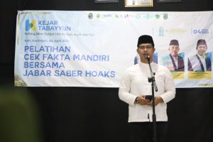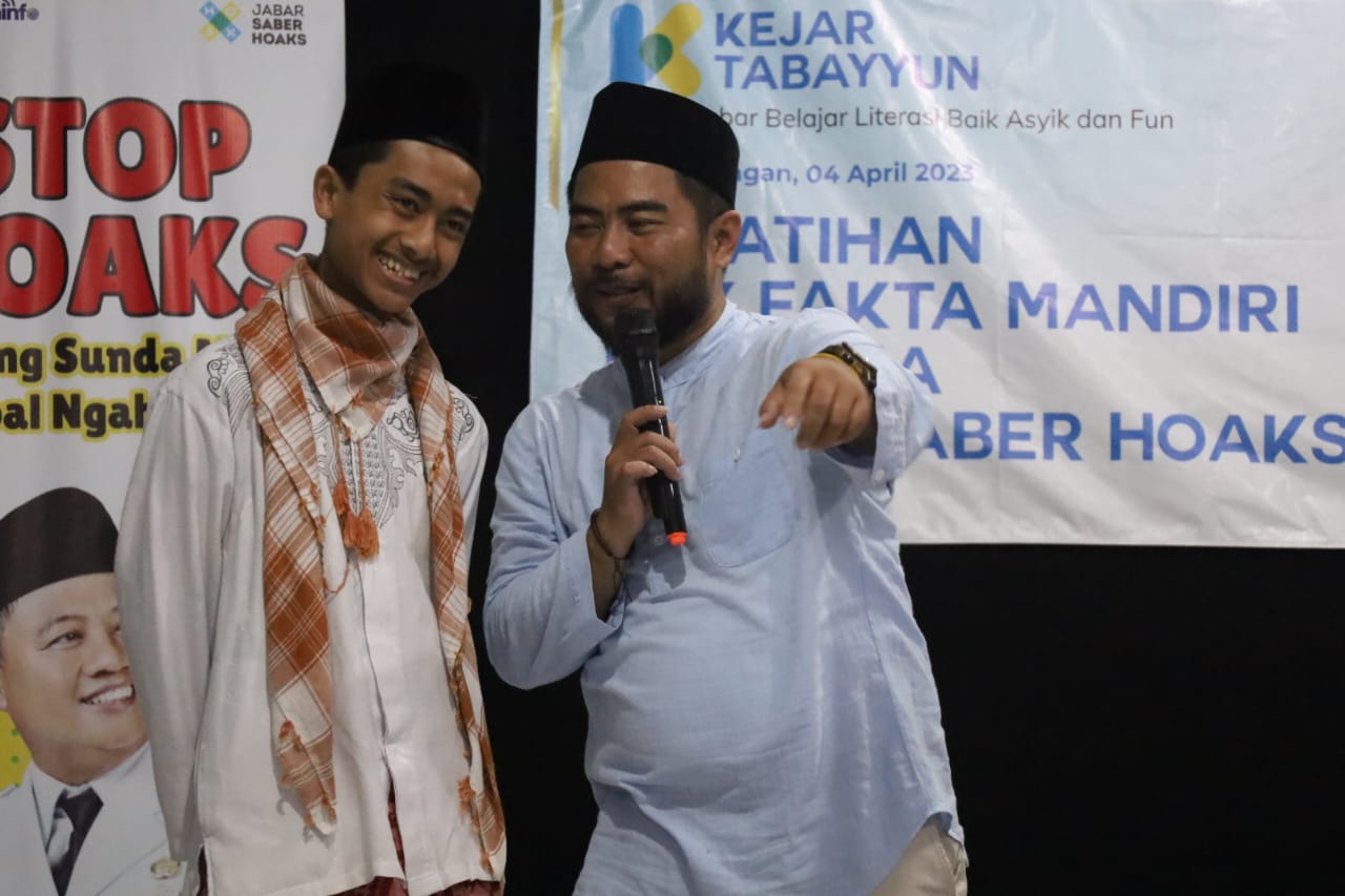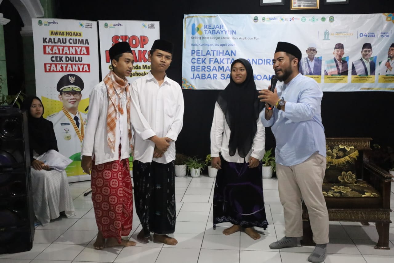 KUNINGAN – Santri Pondok Pesantren Al-Mutawally berlatih cek fakta mandiri bersama Jabar Saber Hoaks pada acara kejar tabayun yang diselenggarakan Pemerintah Provinsi Jawa barat kerja bareng Pemkab Kuningan melalui Dinas Komunikasi Informatika, Cilimus, Selasa (4/4/2023)