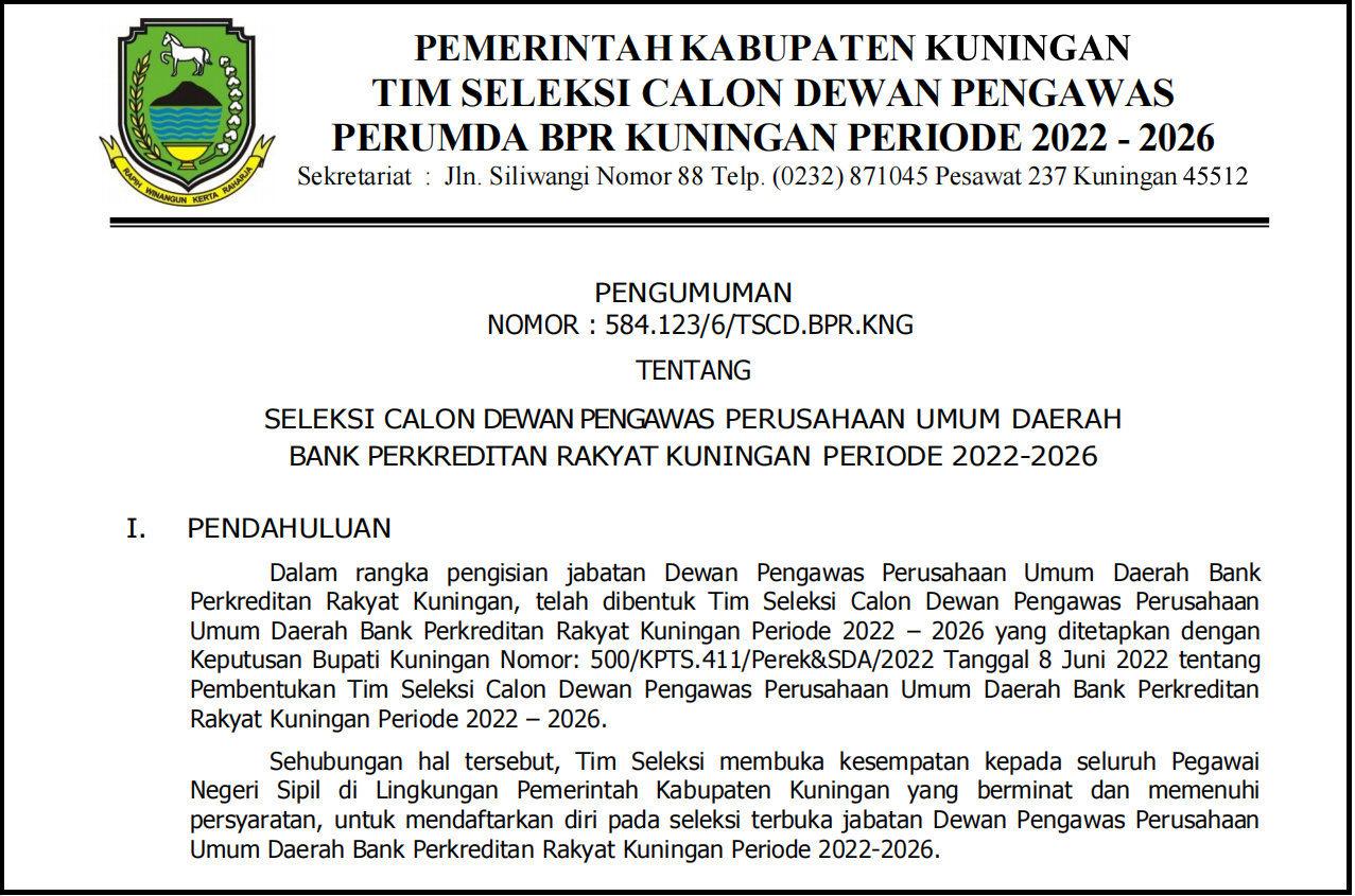 Sehubungan hal tersebut, Tim Seleksi membuka kesempatan kepada seluruh Pegawai Negeri Sipil di Lingkungan Pemerintah Kabupaten Kuningan yang berminat dan memenuhi persyaratan, untuk mendaftarkan diri pada seleksi terbuka jabatan Dewan Pengawas Perusahaan Umum Daerah Bank Perkreditan Rakyat Kuningan Periode 2022-2026.