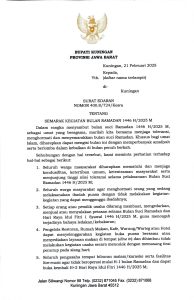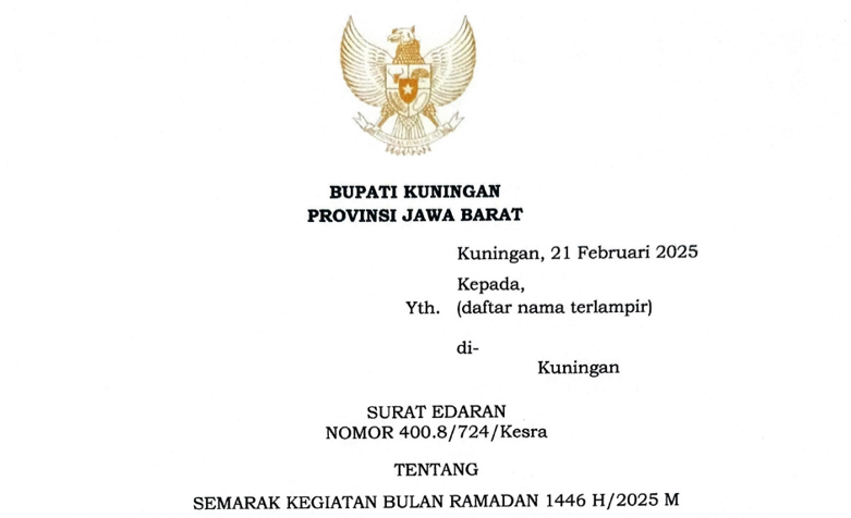 KUNINGAN – Dalam rangka menyambut bulan suci Ramadhan 1446 H/2025 M, Pemerintah Daerah Kabupaten Kuningan mengeluarkan Surat Edaran Nomor 400.8/724/Kesra tentang Semarak Kegiatan Bulan Ramadhan. Surat edaran ini ditandatangani oleh Wakil Bupati Kuningan, Hj. Tuti Andriani, SH. M.Kn, pada 21 Februari 2025.
