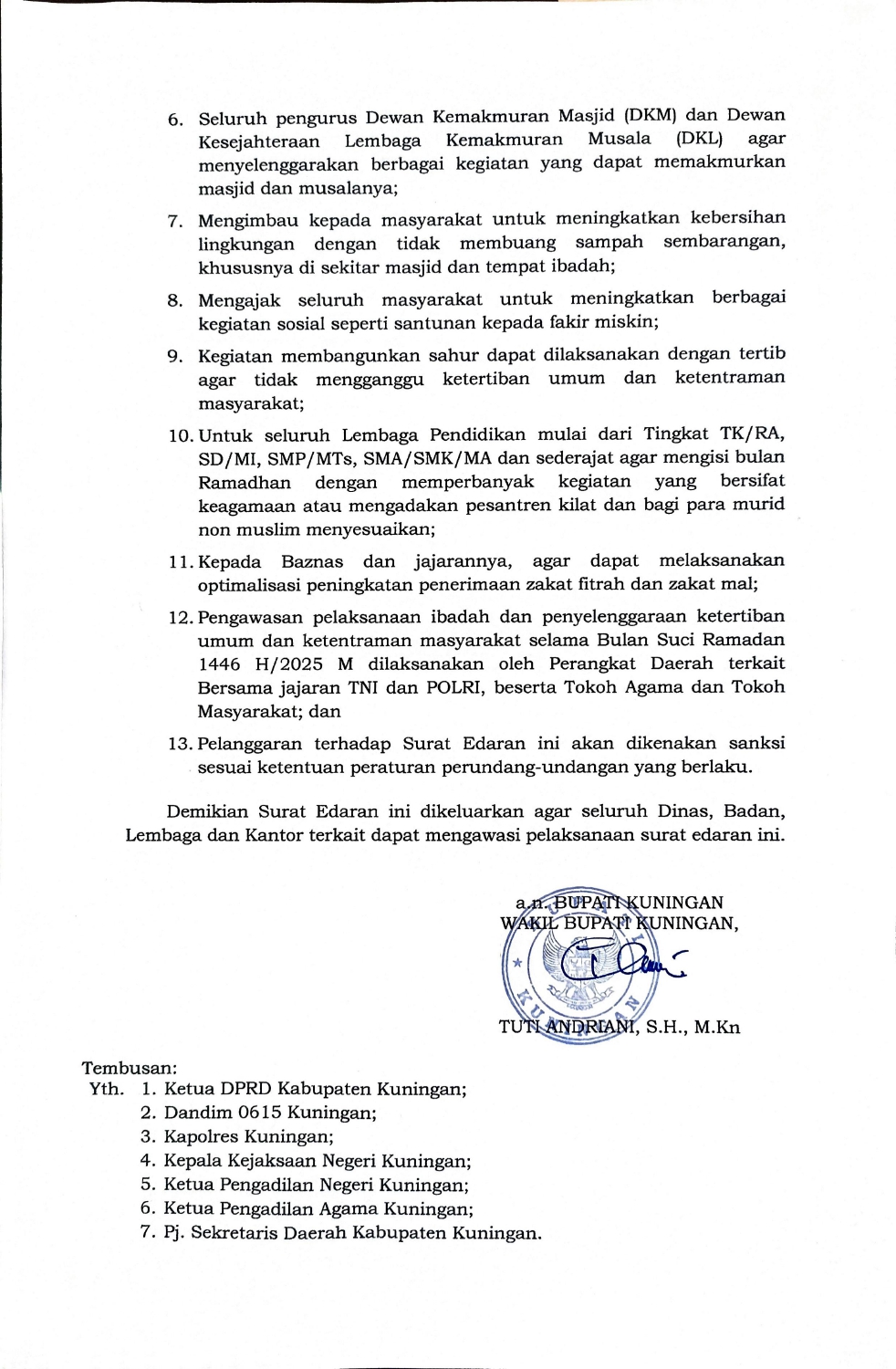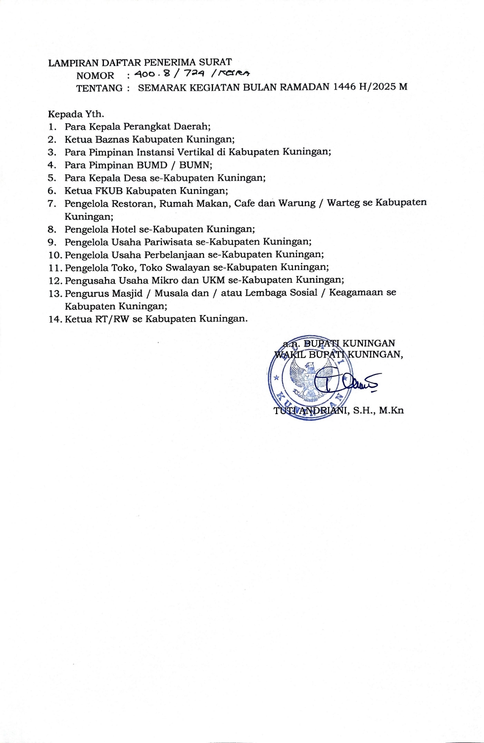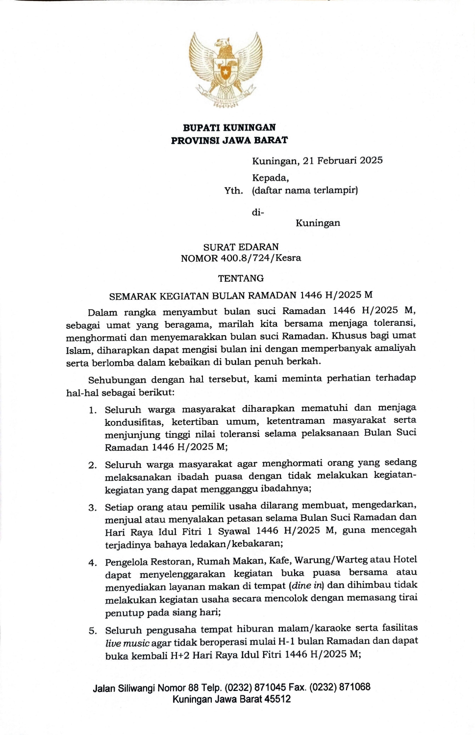 Surat Edaran tersebut ditujukan kepada Para Kepala Perangkat Daerah, BAZNAS Kuningan, Instansi Vertikal, Kepala Desa, Ketua FKUB, Pengelola rumah makan dan sejenisnya, pengelola hotel, usaha pariwisata, toko, usaha mikro dan UMKM, pengurus masjid, mushola, lembaga sosial dan Ketua RT/RW, agar disosialisasikan kepada masyarakat . (IKP/DISKOMINFO)