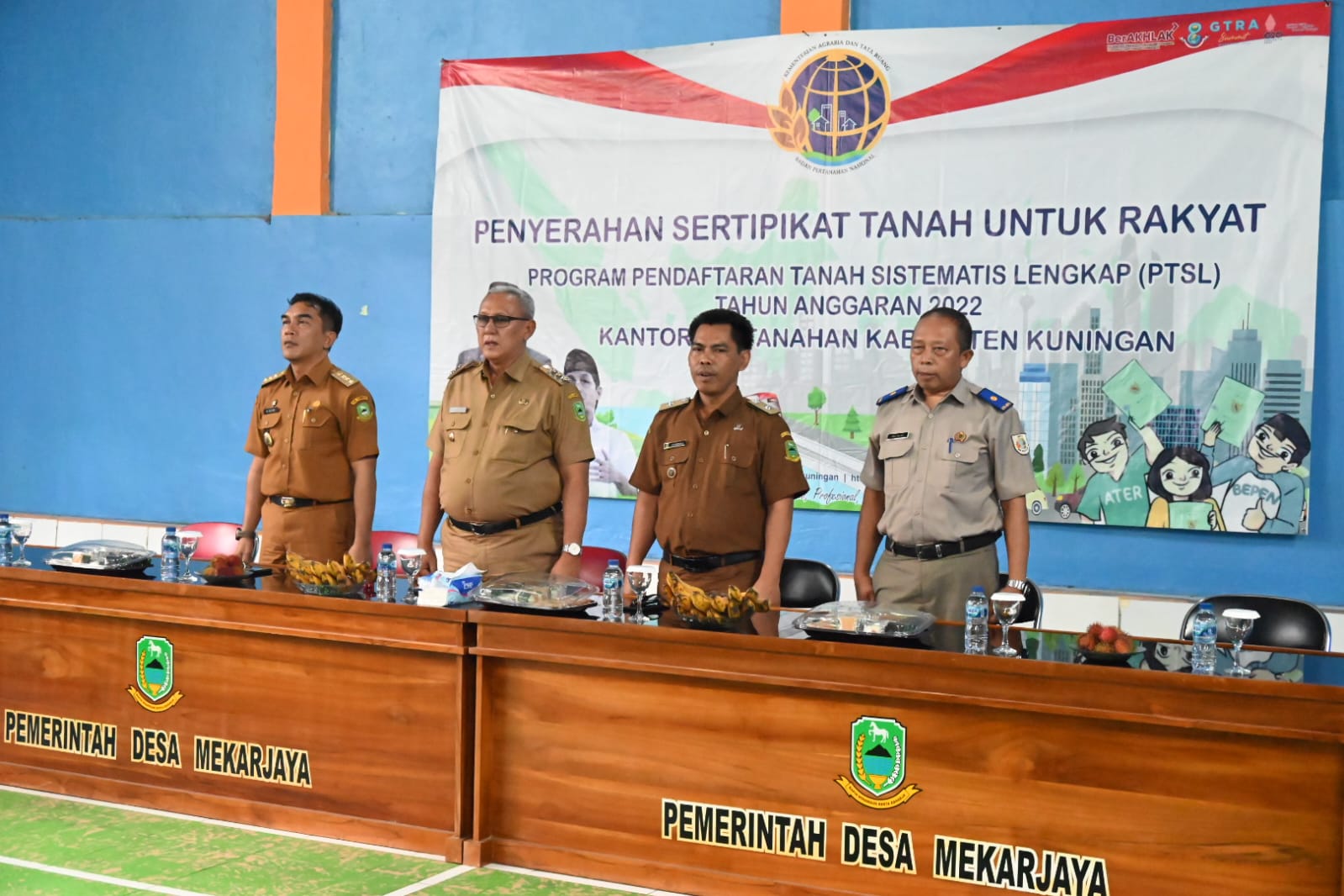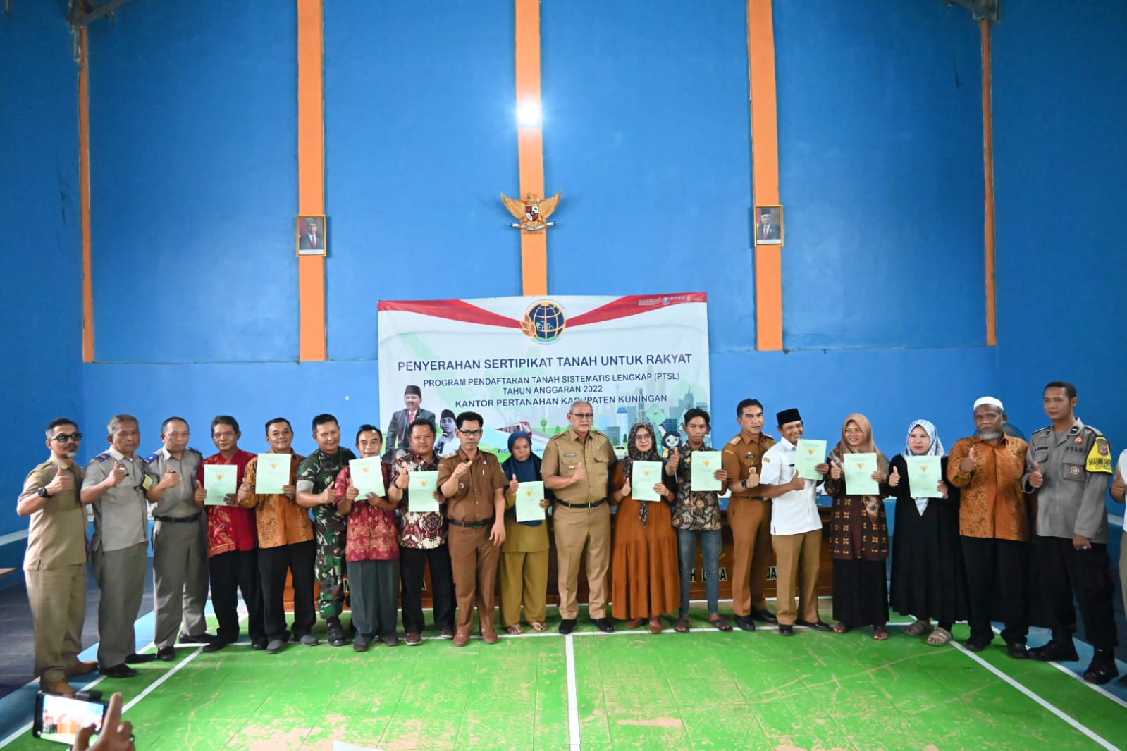 KUNINGAN – Bupati Kuningan H. Acep Purnama SH MH bersama ATR/BPN Kuningan hari ini menyerahkan sertipikat program Pendaftaran Tanah Sistematis Lengkap (PTSL) di Desa Mekarjaya Kecamatan Ciawigebang, Selasa (31/1/2022).