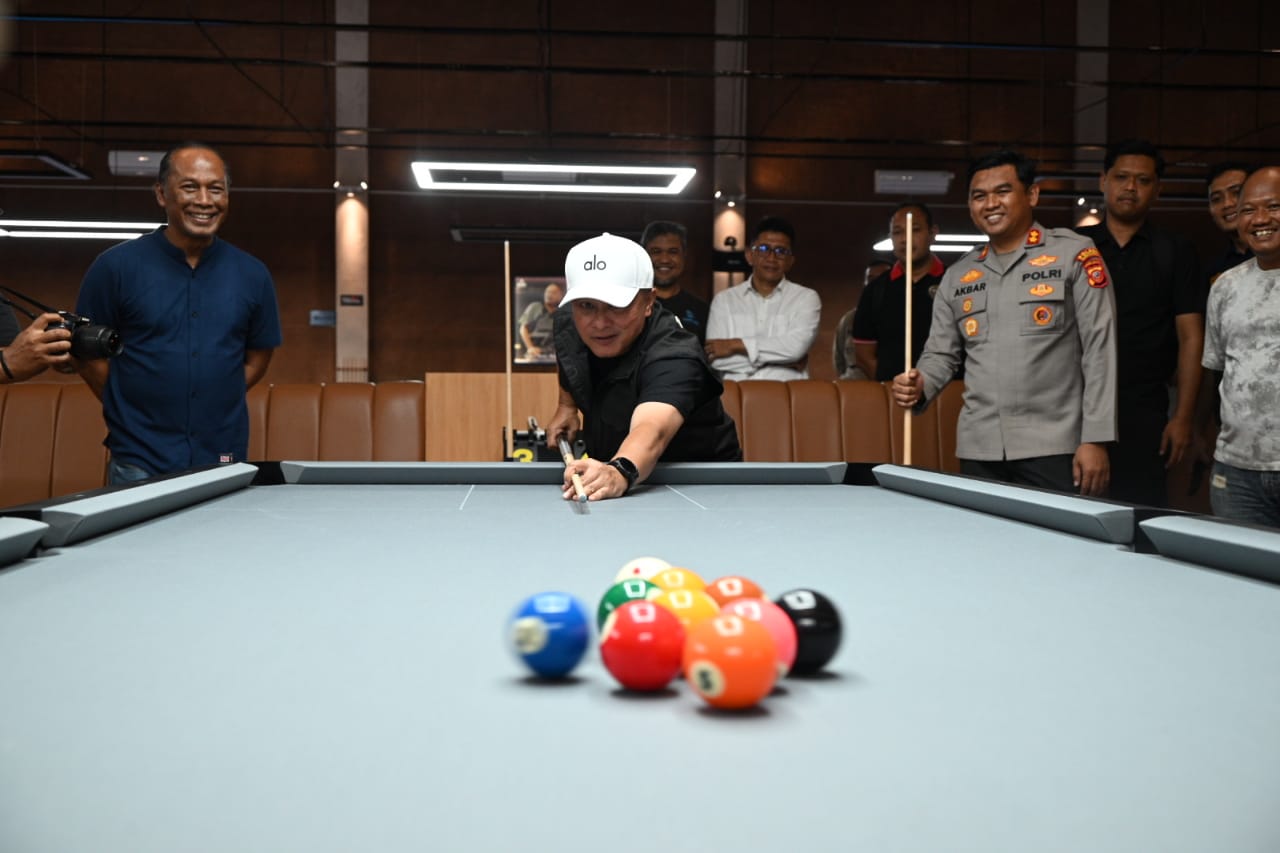 Pada kesempatan itu, Bupati Dian bersama Kapolres Kuningan turut mencoba fasilitas permainan biliar. Tampak kualitas meja biliar yang istimewa dan suasana interior yang nyaman.