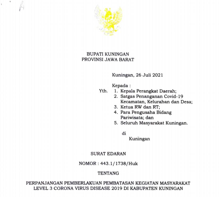 Surat Edaran Bupati Nomor 443.1/1783/Huk Tentang Perpanjangan Pemberlakuan Pembatasan Kegiatan Masyatakat Level 3 Covid-19 Di Kabupaten Kuningan