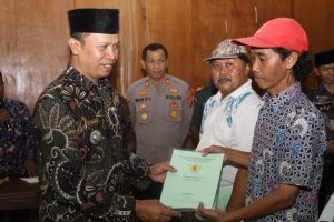 KUNINGAN- Wajah sumringah terpancar dari ratusan warga Desa Karangtawang, Kecamatan Kuningan, ketika menerima sertifikat hak milik tanah dari ATR/BPN Kantor Pertanahan Kabupaten Kuningan melalui Program Pendaftaran Tanah Sistematis Lengkap berbasis Partisipasi Masyarakat (PTSL PM) Tahun 2023, di Aula kantor pemerintahan desa setempat, Jumat (12/1/2024) siang.