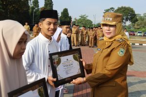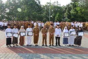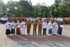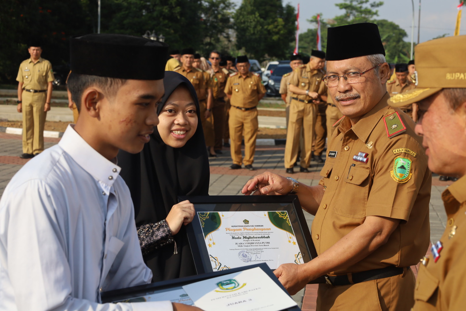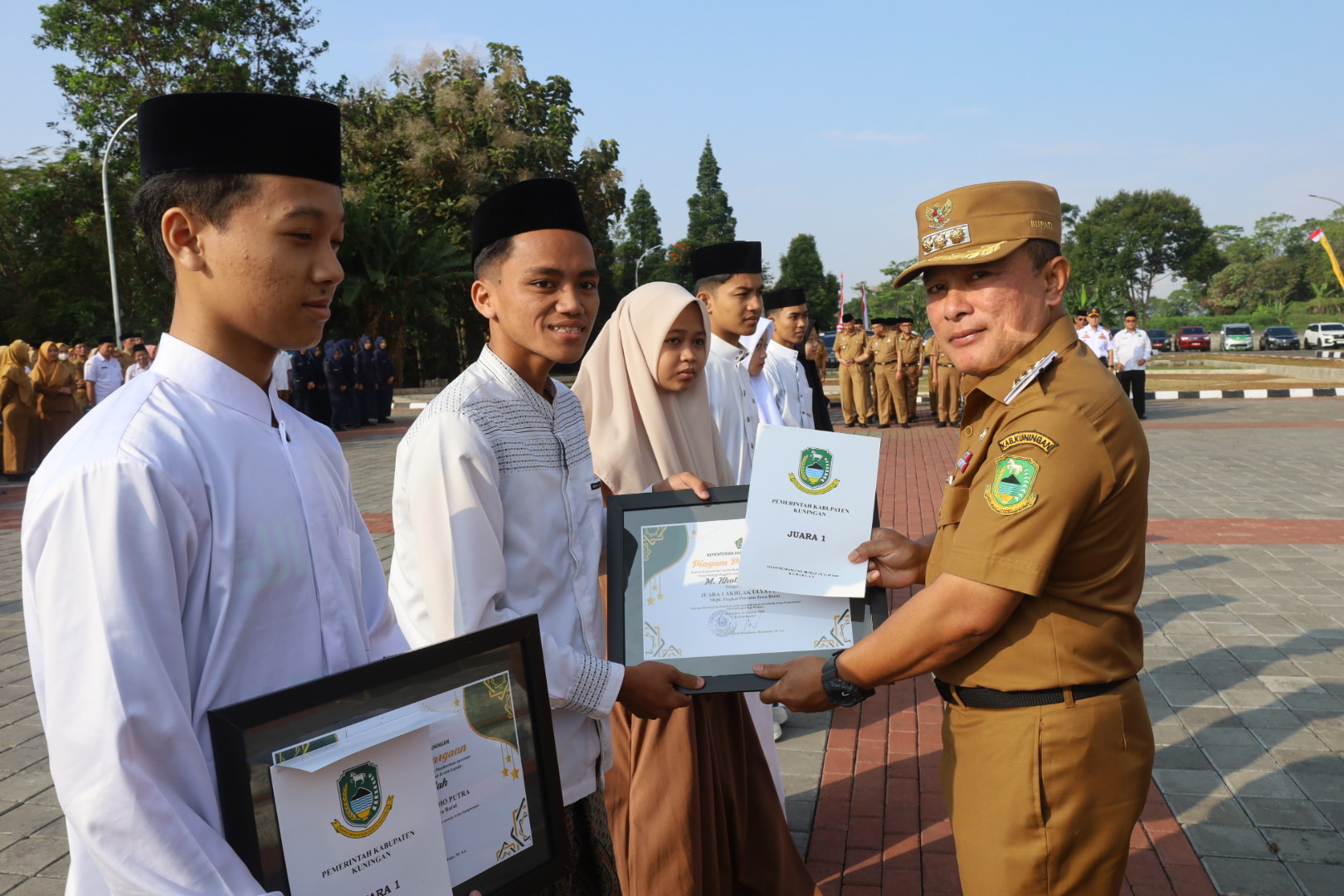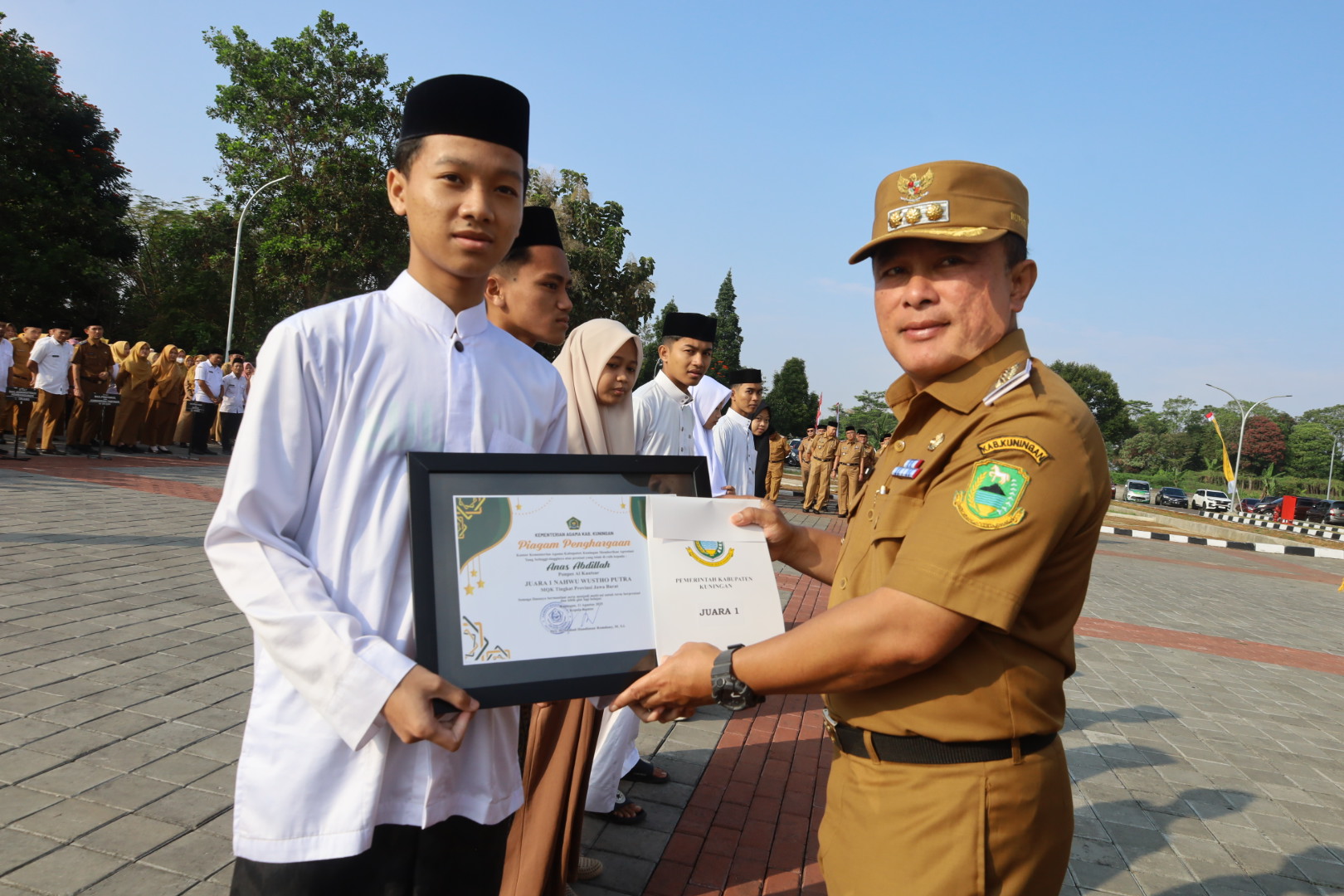 Penghargaan kepada para juara diserahkan langsung oleh Bupati Kuningan, Dr. H. Dian Rachmat Yanuar, M.Si., usai Apel Pagi di Halaman Kantor Setda, Kompleks Kuningan Islamic Centre, Senin (11/8/2025).