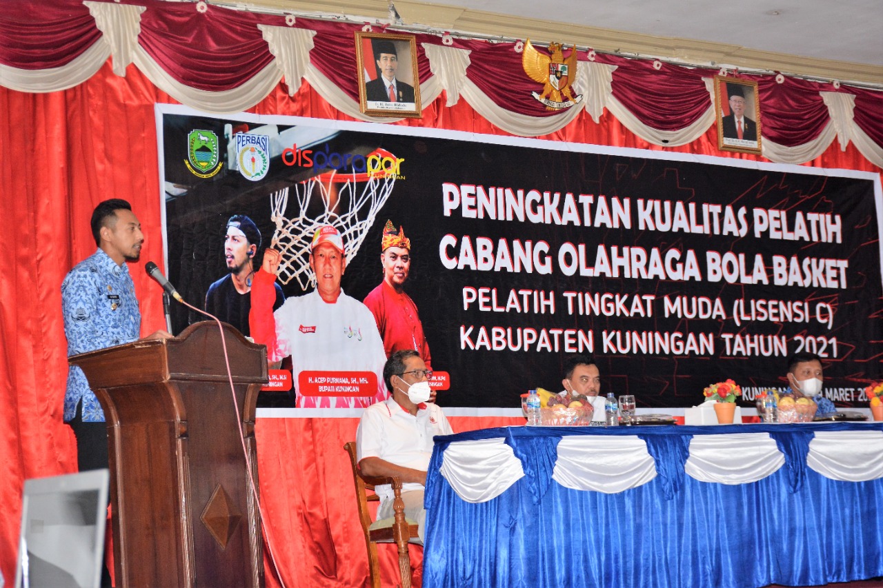 CILIMUS,- Demi meningkatkan kualitas pelatih cabang olahraga bola basket di Kabupaten Kuningan, Pemerintah Kabupaten Kuningan melalui Dinas Pemuda, Olahraga, dan Pariwisata (Disorapar) menggelar kegiatan Peningkatan Kualitas Pelatih Cabang Olahraga Bola Basket Tingkat Muda Lisensi C Tahun 2021 bagi pelatih Persatuan Basket Seluruh Indonesia (Perbasi) Kab.Kuningan.