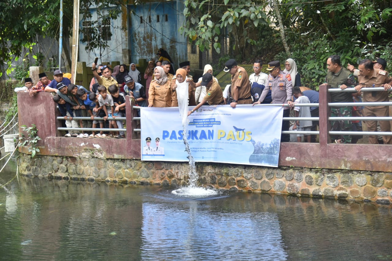 KUNINGAN – Wakil Bupati Kuningan Tuti Andriani, S.H., M.Kn menghadiri kegiatan Gebyar Pasukan Paus (Penebaran Benih Ikan di Seratus Titik Perairan Umum dan Sekitarnya) di Embung Cirumput Desa Situsari Kecamatan Darma, Senin (24/03/2025)