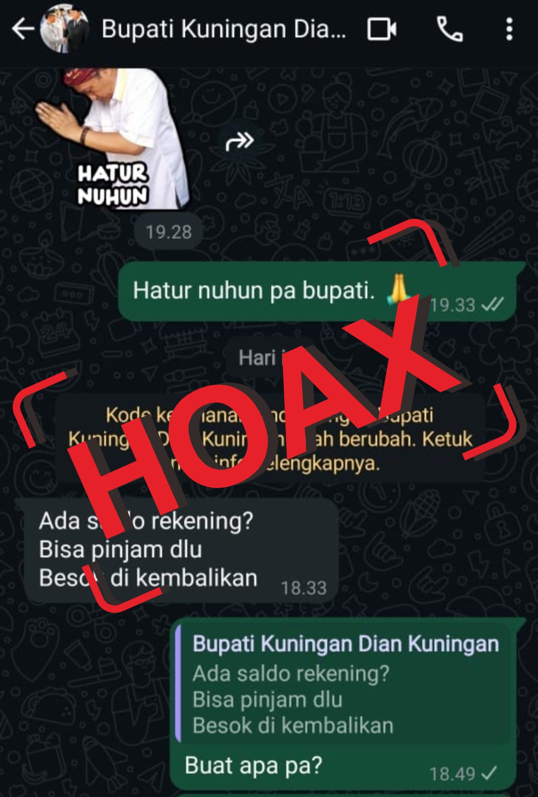 Bupati Kuningan melalui Kepala Diskominfo Kuningan mengimbau masyarakat untuk selalu waspada terhadap segala bentuk penipuan digital dan segera melakukan konfirmasi jika menerima pesan mencurigakan serupa. (IKP/DISKOMINFO)