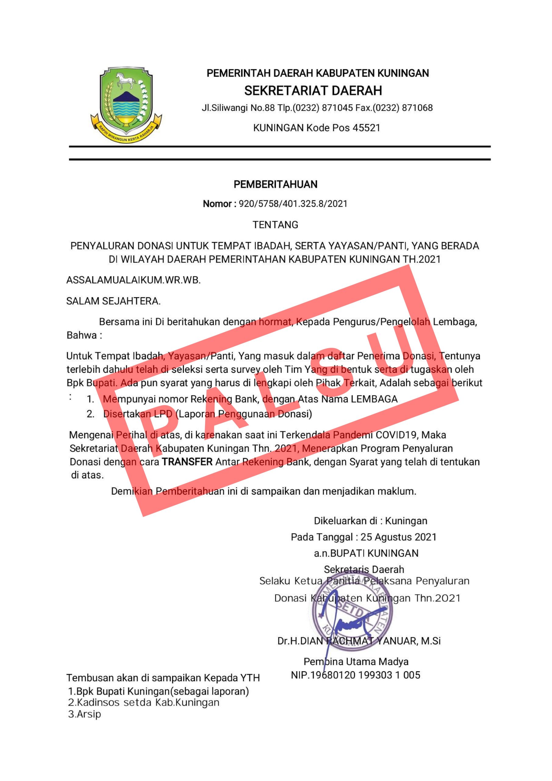 Sekretaris Daerah Kabupaten Kuningan, Dr. H. Dian Rachmat Yanuar, M.Si, menegaskan, jika surat yang beredar tersebut merupakan palsu.