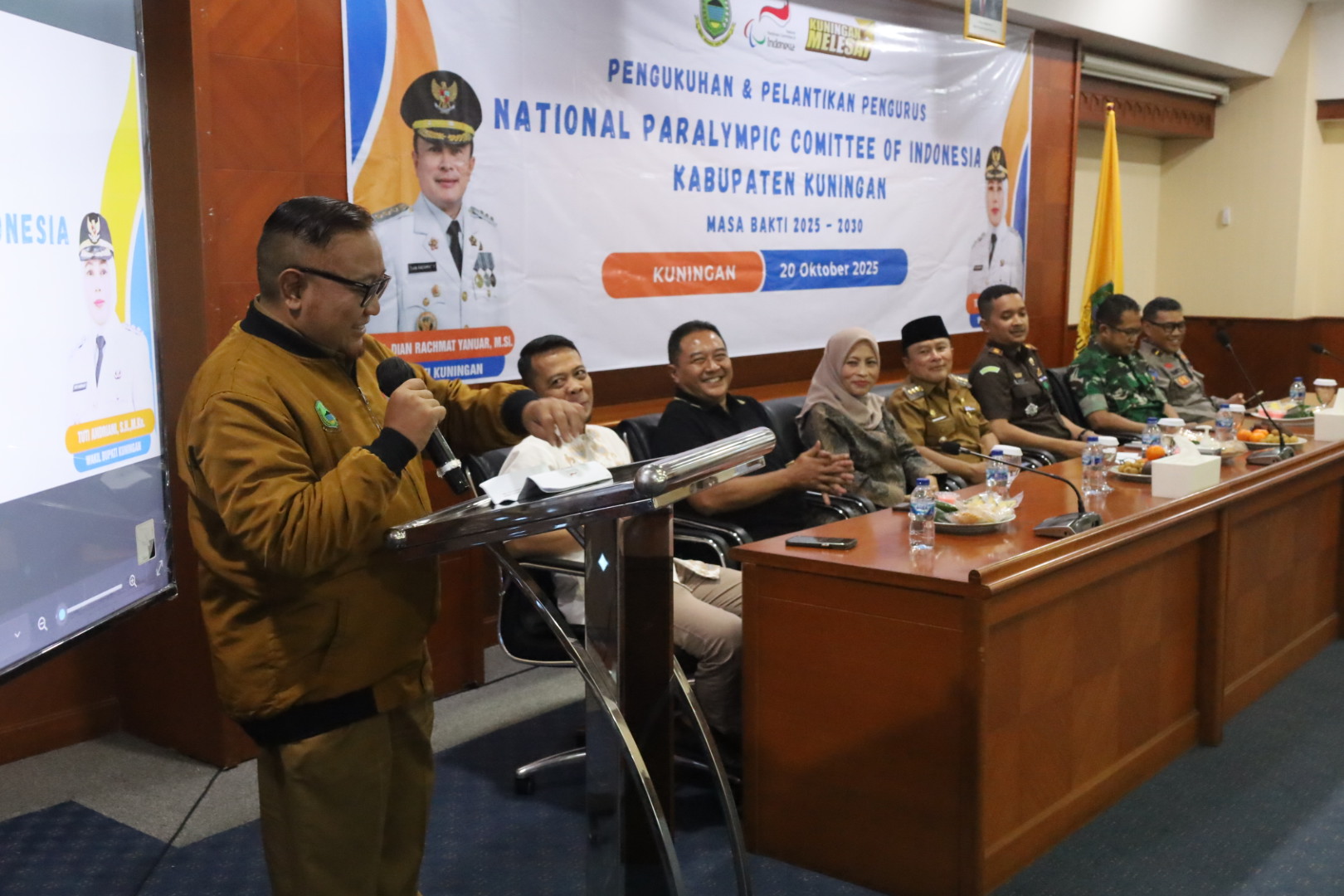 KUNINGAN – Wibawa Gumbira, S.Sos., M.Pd. resmi memimpin National Paralympic Committee Indonesia (NPCI) Kabupaten Kuningan periode 2025–2030. Ia dilantik bersama pengurus oleh Ketua NPCI Provinsi Jawa Barat, Hari Susanto, di Aula Bank BJB Kuningan, Senin (20/10/2025), disaksikan Bupati Kuningan.